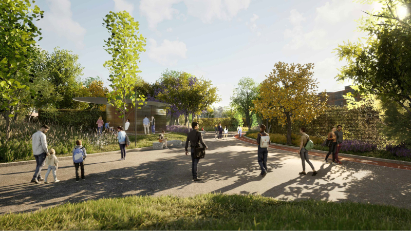 Il Nodo verde prevede la realizzazione di una piastra dotata di un nuovo parco urbano arricchito da servizi fruibili dalla comunità e da nuovi percorsi ciclabili e pedonali.