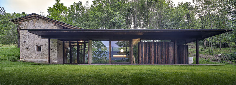 Da teatro di vita contadina a casa-rifugio, riadattata in funzione delle esigenze contemporanee. Un progetto nato dalla volontà del progettista, che ha recuperato e ampliato un antico rudere in pietra, immerso nel verde dei boschi di Roccasparvera.