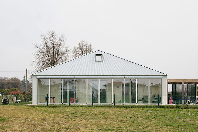 La piccola dimora suburbana, realizzata vicino a Vicenza, è ironicamente progettata sul modello di un'antica villa rinascimentale, costruita solo con materiali ecologici (legno, paglia, calce, argilla).