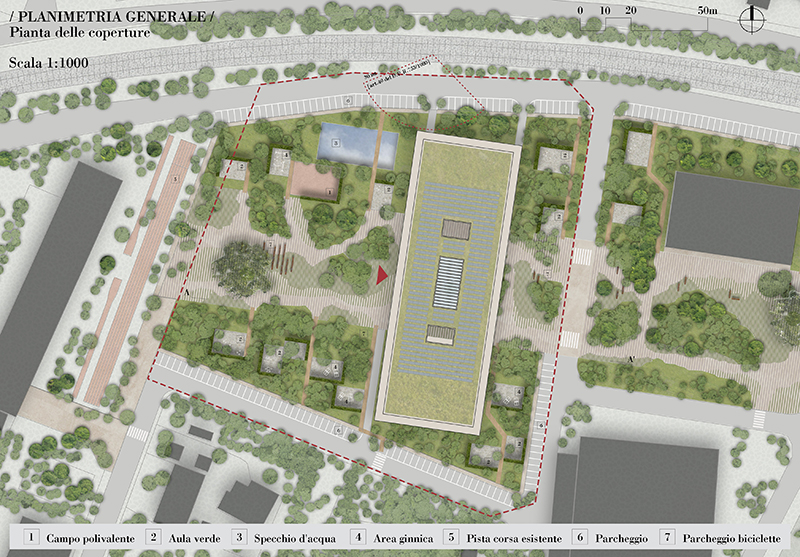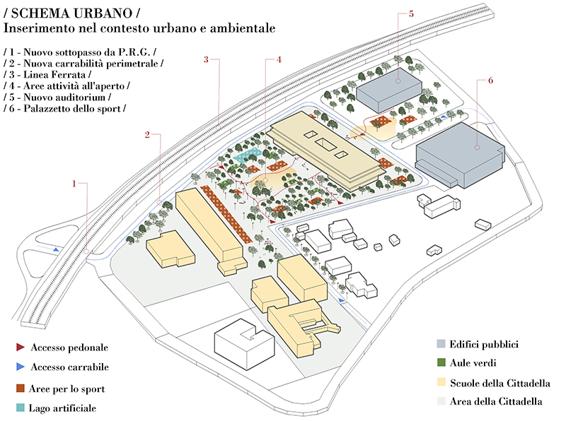 L'area di progetto, circondata su tutti i fronti dal verde, è attraversata da un asse est-ovest che connette il futuro Auditorium (ancora in fase di studio) con il nuovo edificio scolastico e fino agli altri istituti e alle aree sportive esistenti. Si viene a creare, così, un grande spazio arioso flessibile e fluido che apre lo scenario ad una molteplicità di usi diversi autonomi ma anche interconnessi tra loro.