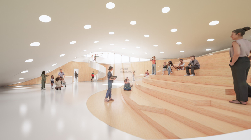 Il tetto come un mantello sinuoso che funziona da raccordo per il salto di quota e dà riparo a un mix di funzioni: spazi dedicati all'accoglienza, ludico-creativi per l'infanzia, laboratori e persino un'area dove le mamme possono allattare e i bambini appisolarsi. Sta per nascere a Ripa Teatina, un paesino con meno di 4mila anime in provincia di Chieti, un centro polifunzionale a misura di famiglia. A progettarlo è Lap Architettura, il giovane e promettente studio fondato nel 2015 da Daniel Caramanico, Federico Sorgi e Simone Esposito.