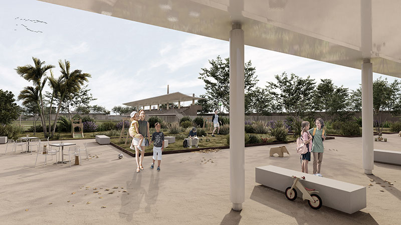 La nuova agorà appare come uno spazio fluido e dinamico, definito dai percorsi pedonali che inquadrano aree adibite a giardino, con diverse funzioni quali parco giochi per bambini, aree di sosta, aree piantumate ed aree per lo sport. All'interno dell'area sono poi realizzati due nuovi piccoli edifici con funzioni di biglietteria, uffici e locale ristoro.