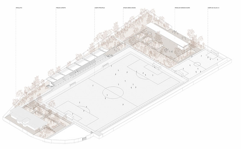 La piazza pubblica, invece, parte dalla riqualificazione del campo di calcio a 7, regolarizzato secondo gli standards CONI e trasformato in un campo di calcio a 5 regolamentare per competizioni nazionali e internazionali. Così riordinato, lo spazio si apre alla città, anche grazie alla demolizione del muro di recinzione esistente, sostituito da una rete metallica a bordo campo.