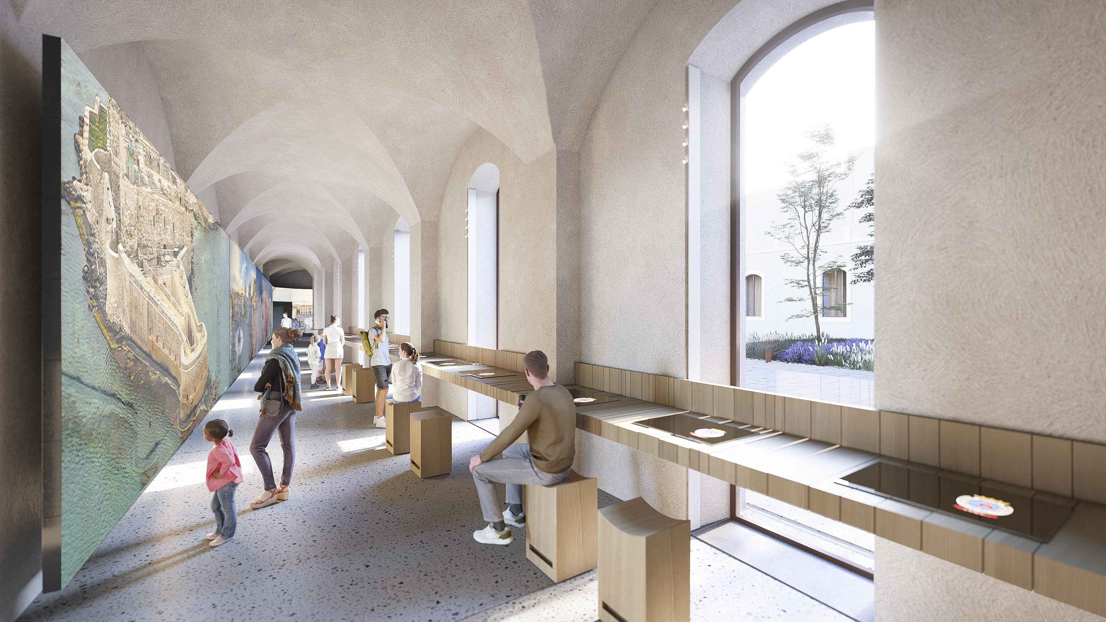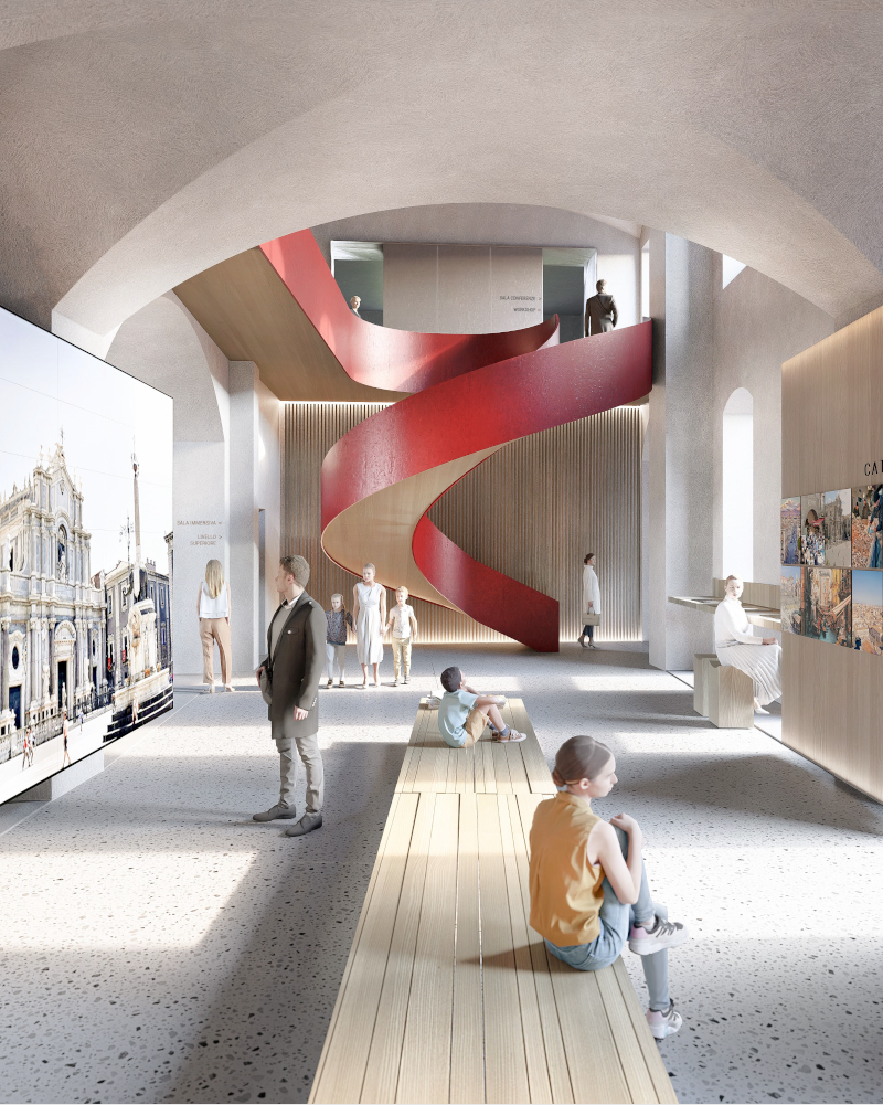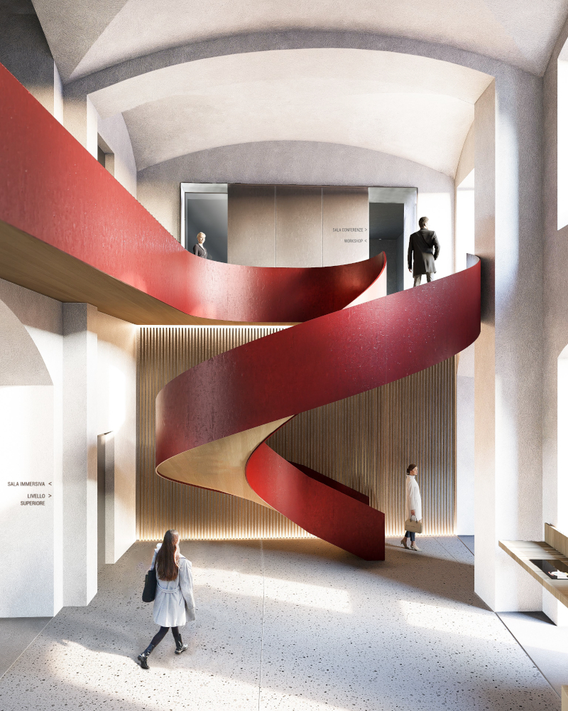 Il progetto prevede, inoltre, l'inserimento di una grande parete multimediale composta da ledwall, videowall e schermi per proiezioni, che si estenderà per 53 metri conducendo i visitatori fino alla sala multimediale principale e all'area interattiva dedicata ai bambini. Un percorso che termina nell'area immersiva multisensoriale. Questa è immaginata - spiegano i progettisti nella relazione illustrativa - come «una straordinaria opportunità di interagire con l'ambiente circostante in modo totale ed avvolgente, permettendo di sperimentare una vasta gamma di stimoli sensoriali che vanno ben oltre la semplice vista o udito». Il collegamento al piano superiore è realizzato attraverso una scala a spirale in acciaio.