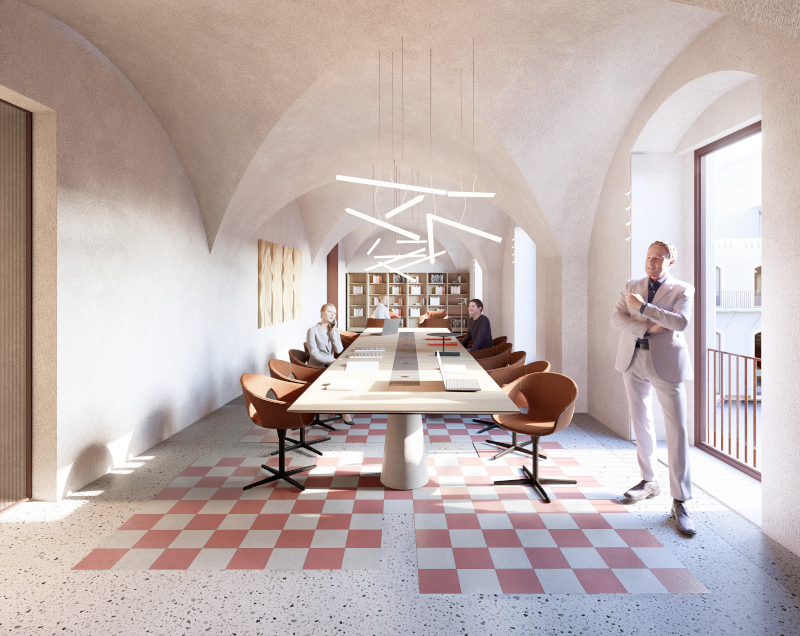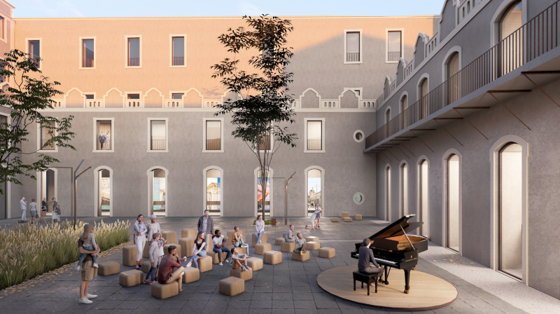 Per le facciate si prevede il rifacimento dell'intonaco e un lavoro di restauro delle superfici di pietra. Su di esse, i progettisti hanno immaginato anche di inserire delle lamine metalliche per esaltare alcune bucature ed in particolare le imbotti dell'ingresso principale, dal quale i passanti possono intravedere la galleria botanica, un'accogliente area verde interna. Ma è la corte il fulcro delle attività, nonché luogo di socialità e di passaggio, che collega le diverse funzioni.