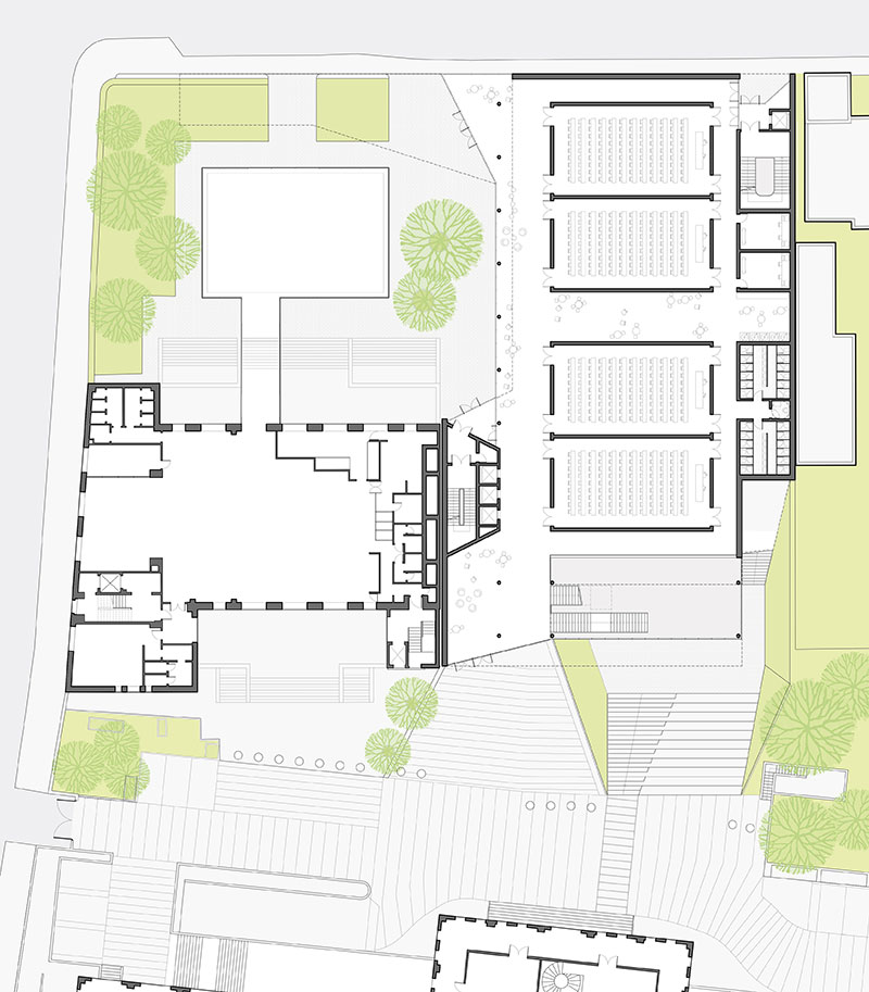 Il tema dei collegamenti verticali è dunque una costante, riscontrabile anche all'esterno, con la grande gradonata accessibile dalla piazza che conduce alla caffetteria posta al piano inferiore, affiancata dall'area destinata al fitness e alla piscina.