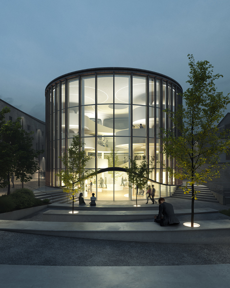 Il nuovo volume, come uno scrigno trasparente, accoglie e custodisce quattro livelli, più uno interrato, che ospiterà il caveau dei volumi da preservare, e una terrazza panoramica che apre su ampie quinte visive.