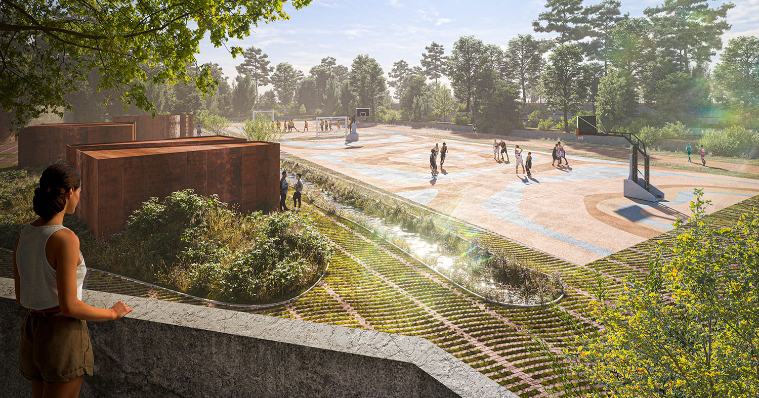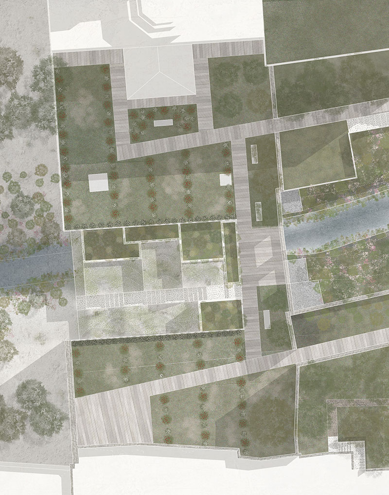 Al centro del progetto è l'elemento acqua, canalizzata e messa in sicurezza attraverso la sistemazione idraulica locale per garantire l'equilibrio geonaturale e la riqualificazione degli spazi verdi.