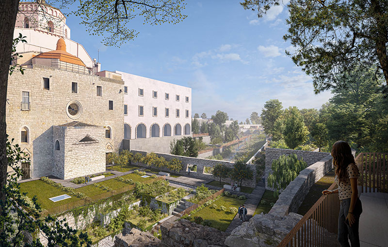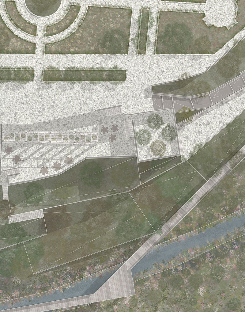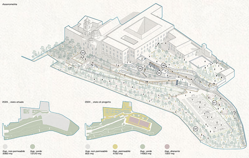 La cura del disegno sottolinea l'importanza dei percorsi, orientati a garantire piena accessibilità dalla superficie fino ai livelli più bassi, potenziando conoscenza e inclusività. Non da meno, il progetto funge da elemento di congiunzione tra i diversi ambiti territoriali, attraverso rapidi spostamenti tra le zone funzionali e lente immersioni esplorative nelle parti storiche e naturalistiche.