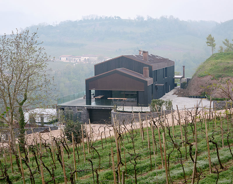 Stagliandosi sullo sfondo naturale in modo garbato, la nuova costruzione rappresenta perfettamente lo spirito e i valori del paesaggio con cui si confronta, gli stessi dei vini naturali prodotti da questa piccola cantina tra le colline.