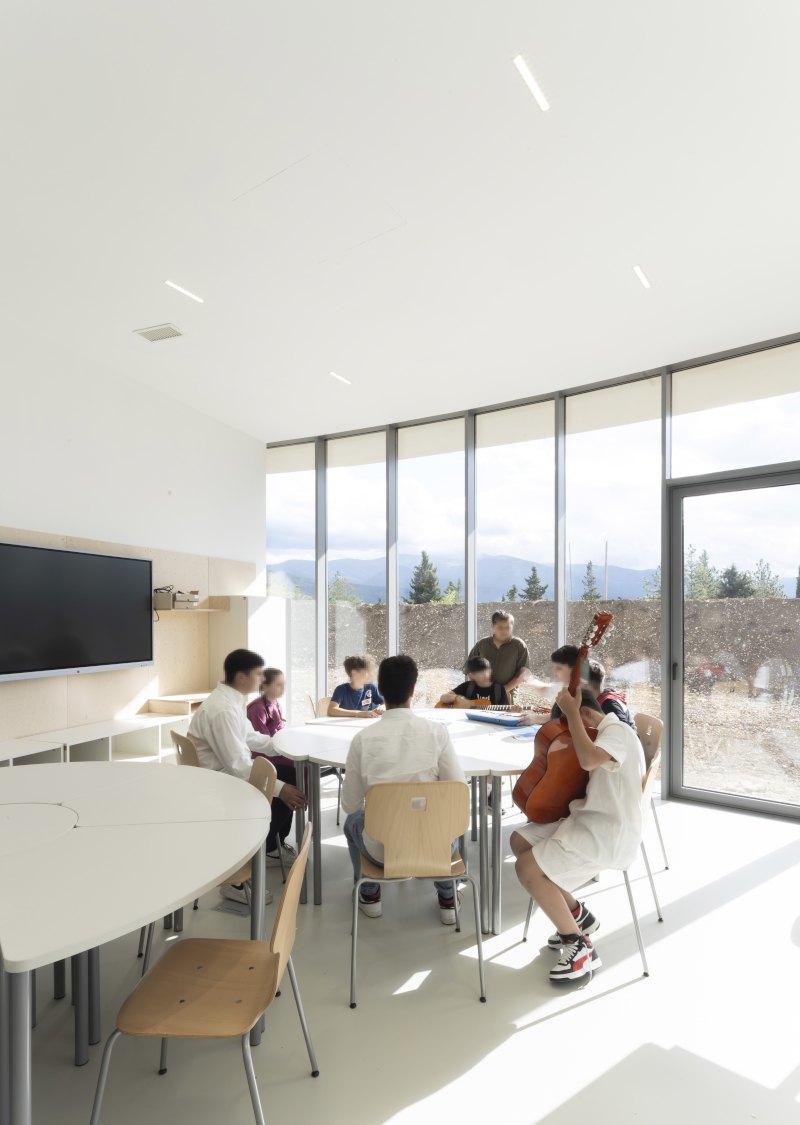 Tutti gli ambienti didattici si sviluppano attorno all'agorà centrale e sono definiti da grandi pareti curve, trasparenti e scorrevoli che li rendono ampiamente flessibili e rimodulabili sulla base delle esigenze quotidiane della vita scolastica. Gli interni, inoltre, sono pensati per essere costantemente in dialogo con l'esterno grazie alla presenza di ampie vetrate continue che si affacciano sul panorama appenninico circostante. Il nuovo polo scolastico è dotato, inoltre, di una mensa progettata a vista e delimitata da vetrate per essere un atelier del cibo, così da promuovere l'apprendimento e diffondere una cultura gastronomica tra i giovani studenti.