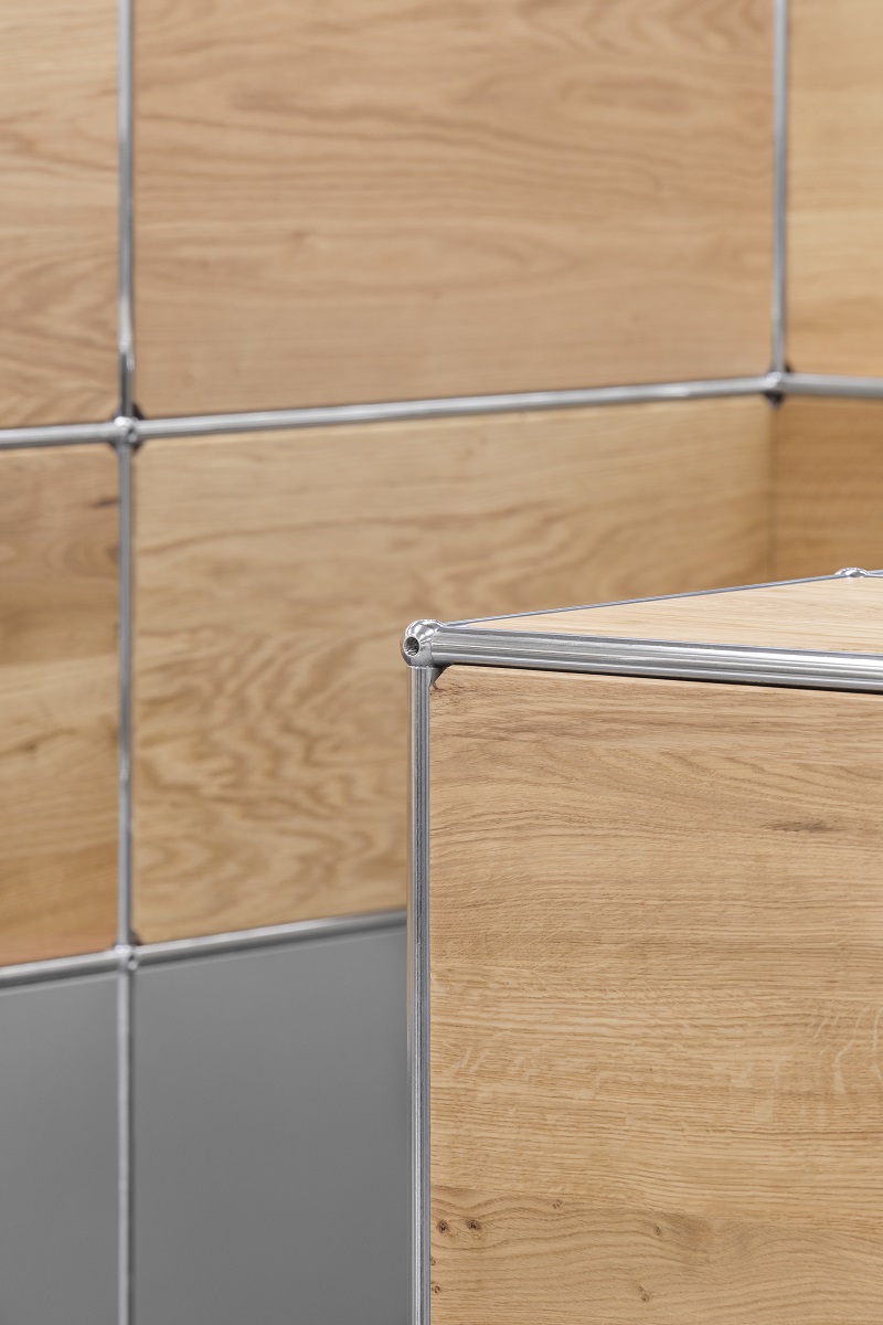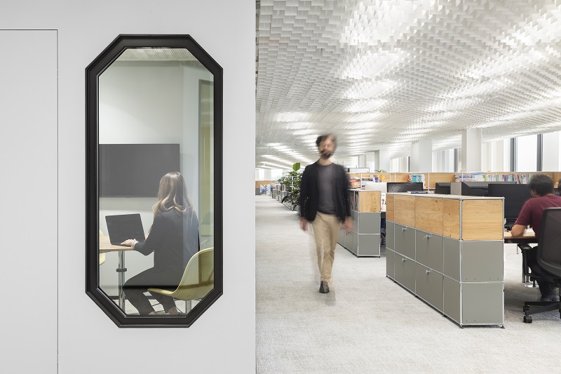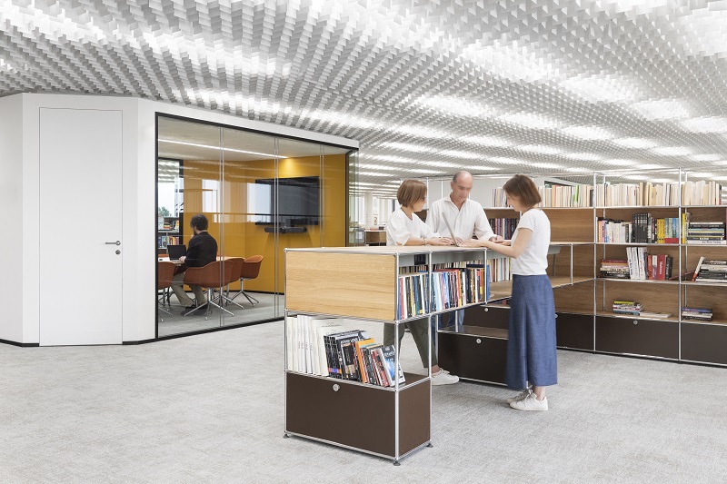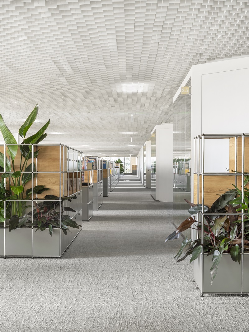 In collaborazione con Maestro Technology, l'ultima startup nata dal gruppo, Cra ha recuperato oltre 1300 arredi modulari originali dell'edificio. I classici mobili del dopoguerra del produttore svizzero USM sono stati accuratamente smontati e rimontati, integrando il legno e creando ulteriori moduli riconfigurabili. Questi interventi includono l'inserimento di spazi per le piante, in modo da introdurre la natura nell'ambiente dell'ufficio.