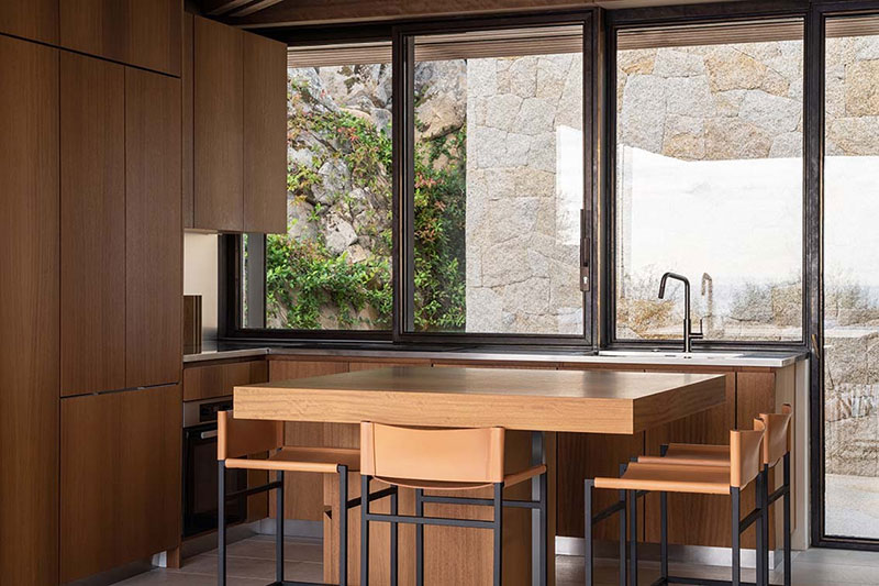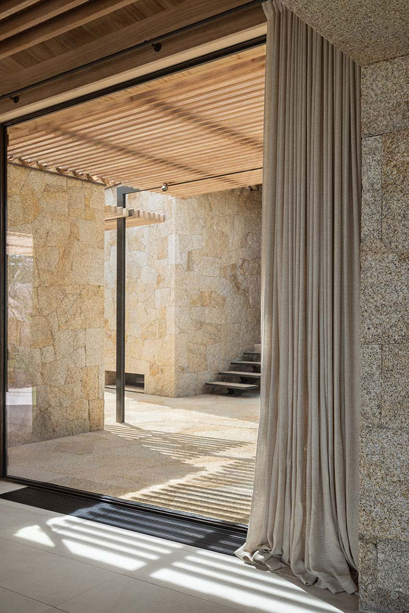 La continuità tra dentro e fuori è enfatizzata dall'utilizzo del granito anche all'interno, con i blocchi di pietra a spacco naturale senza fughe, opera delle abili capacità delle maestranze locali, contrapposti alla leggerezza delle ampie vetrate che donano ai prospetti dinamismo e luce naturale a volontà.