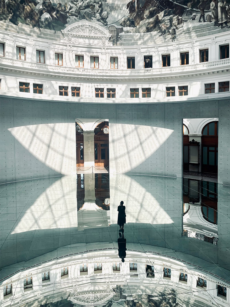 Così l'immenso e monumentale specchio sul pavimento - in accordo con il pensiero di Tadao Ando e la sua ricerca di un'architettura del vuoto e dell'infinito - inverte l'architettura e l'ordine delle cose, con il cielo che si apre al centro dell'edificio, sotto i piedi di chi vi passa sopra.