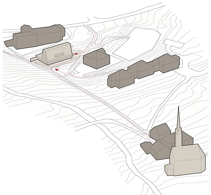 A caratterizzare l'intervento è la sua misurata collocazione nel sito: nel fronte nord, su via Pré de Lejia, il volume arretra generando un ampio spazio di accoglienza che definisce l'ingresso al Comune; nel fronte opposto, invece, l'edificio si rapporta con l'antica strada Antersieff. Ne deriva, così, un disegno ricco di spazi per la sosta che fungono da punto di inizio per la passeggiata verso la Pieve di San Giovanni.