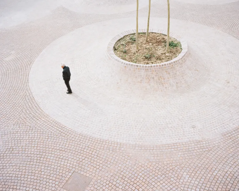 Queste isole verdi appaiono quindi come tronchi di cono di diametro variabile che, affiorando dal suolo, raggiungono un'altezza massima di un metro, con una sezione raccordata morbidamente alla quota della piazza. Il contatto è rafforzato anche dalla continuità materica dei cubetti di porfido che danno vita a un ricco disegno geometrico di cerchi concentrici.
