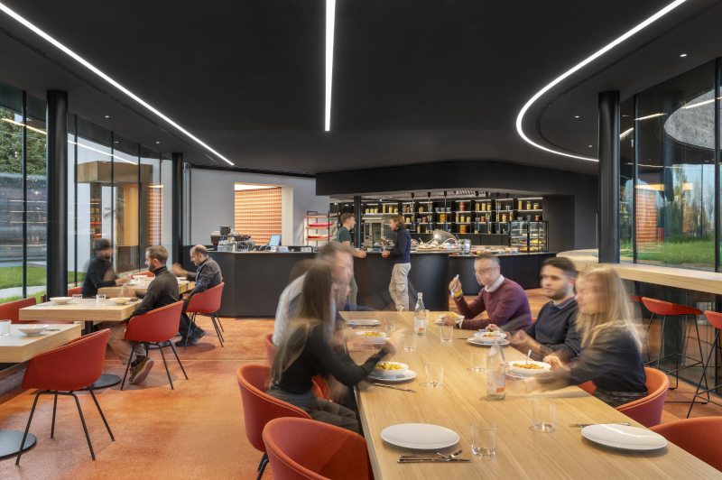 Mensa aziendale di giorno e presto ristorante stellato di notte: "Quisimangia" - questo il nome del locale - sarà gestito da ViCook, la divisione catering dei fratelli Chicco e Bobo Cerea, famosi per i loro ristoranti stellati Michelin a Bergamo, St. Moritz e Shanghai. Adiacente alla nuova sala da pranzo, una vecchia taverna visibile dalla strada è stata ristrutturata per fungere da cucina della mensa.