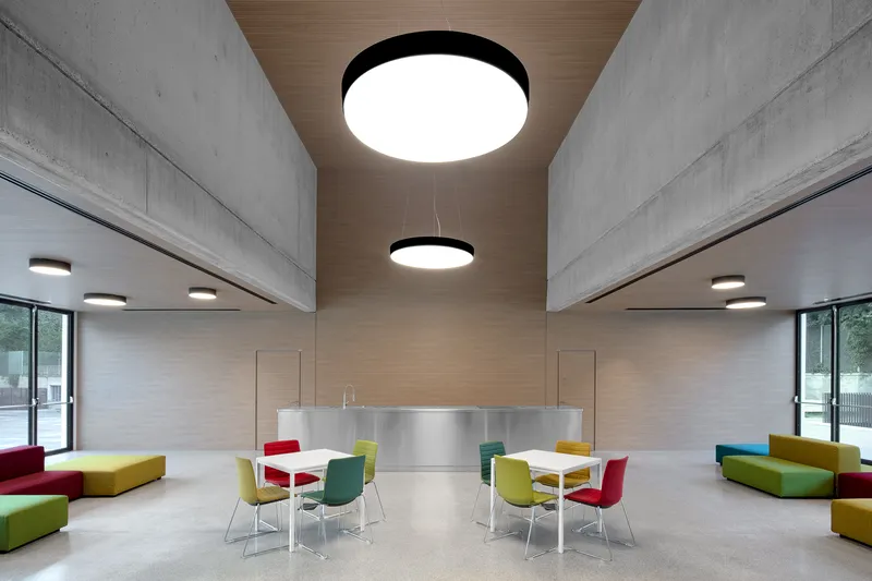Due patii a cielo aperto, che portano aria e luce naturale agli spazi comuni collocati nel piano interrato, compongono una sorta di "chiostro contemporaneo" che connette, attraverso collegamenti pedonali e tunnel sotterranei, i nuovi laboratori con gli edifici storici esistenti.