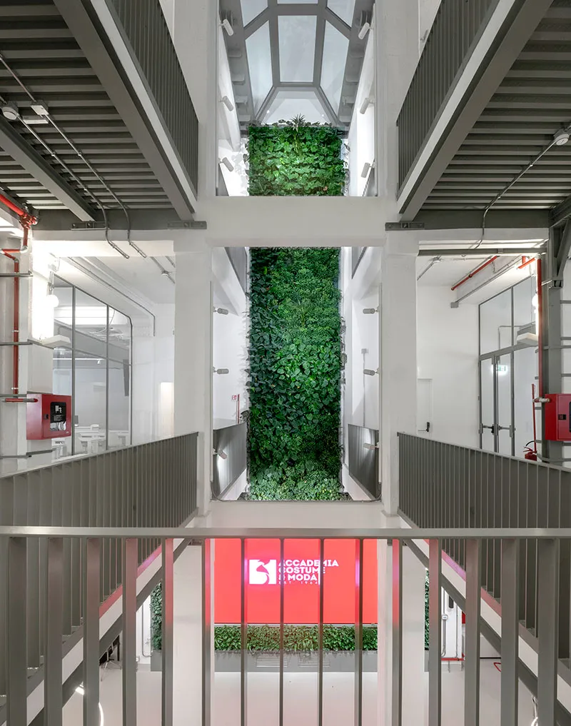 Il tutto viene rafforzato, nella hall di ingresso, da una parete verticale verde "viva" di circa 14 metri di altezza che ha la finalità di stimolare nel fruitore un forte senso di connessione con gli elementi naturali. Gli interni riflettono, infatti, i principi dell'architettura biofilica, per promuovere il benessere psicofisico di chi vive e lavora negli spazi.