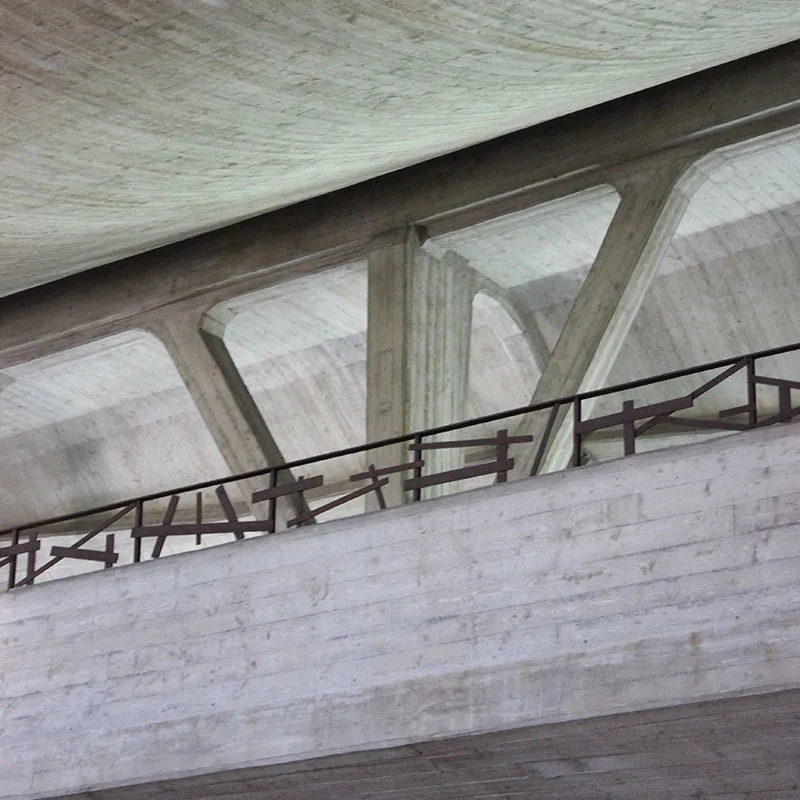 Qui, rispetto alla stazione di Firenze sentiamo un pathos più palpabile, grazie anche alle sculture di Emilio Greco e all'ausilio di quelle silenziose "stanze" di verde dove abitano alcuni ulivi del piccolo giardino laterale alla maniera di un moderno hortus conclusus.