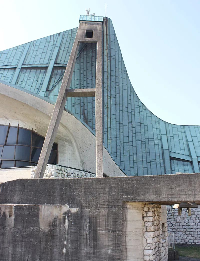 All'interno dell'aula sembra di stare dentro un guscio, un ventre teso di cemento armato che si alza verso il cielo nella tensione dei pilastri verticali. La complessa planimetria può essere letta come la rielaborazione moderna di una basilica paleocristiana così come la presenza del matroneo, elemento fondamentale della tradizione liturgica cristiana nel mediterraneo. Il cerchio poi si chiude attraverso un camminamento che permette, passando per il battistero curvilineo, a sud-ovest di ritornare sul sagrato.