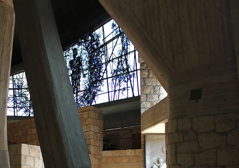 Il percorso dopo alcuni gradini conduce alla grande aula della chiesa che è un tripudio di verticalità e dove la coesistenza di calcestruzzo e pietra rosa di San Giuliano che caratterizza anche gli esterni raggiunge il suo apice di naturalezza.