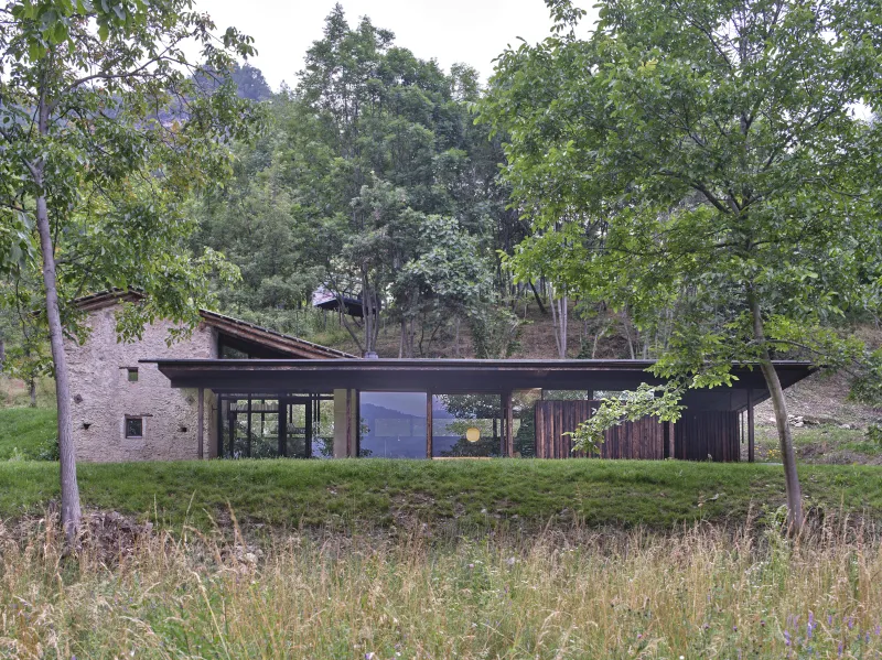 Un rudere abbandonato conquistato dai rovi, immerso nella natura del bosco, diventa una casa-rifugio grazie alla valorizzazione dell'antico luogo di vita contadina e al moderno e misurato ampliamento che utilizza legno di larice bruciato e vetro per dar vita ad un'architettura in simbiosi con il paesaggio. Il luogo è suggestivo: il "buen retiro" nasce tra i boschi affacciati sulla valle Stura a Roccasparvera, in provincia di Cuneo.