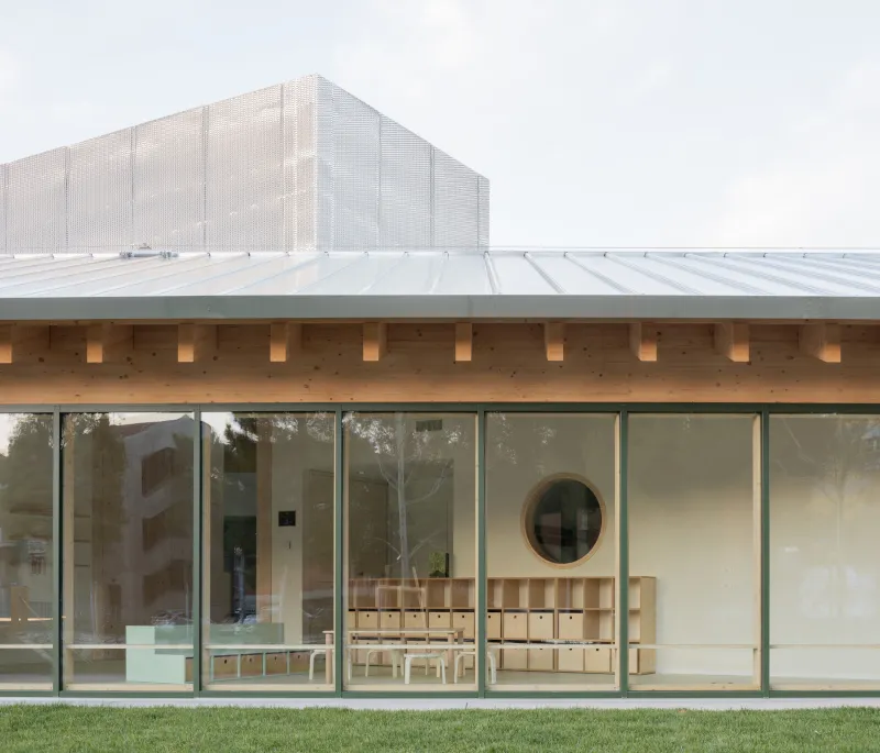 Nata da un concorso del 2022 e parte di un programma di riqualificazione promosso dalla Andrea Bocelli Foundation con il Comune, la scuola in legno, composta da un gioco di volumi disarticolati al di sotto di un generoso tetto a falda, progettata da Bdr bureau - realizzata in soli 150 giorni di cantiere - si estende per una superficie di 600 metri quadrati e ospita circa 70 bambini e bambine, suddivisi in due sezioni di scuola dell'infanzia e una sezione di nido d'infanzia.