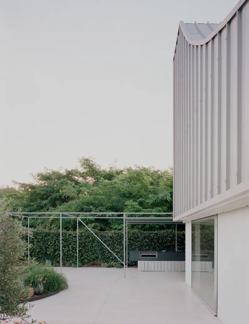 Il pergolato si pone sul limite del plateau in cemento, perpendicolare alla cabina, realizzato con profili tubolari in acciaio zincato, disposti su 5 campate con passo regolare di 2,6 m. Le prime due possono ospitare una zona lounge o pranzo, mentre un lungo bancone cucina, realizzato su misura in pietra e lamiera, occupa altre due campate, protetto da un leggero tetto di lamiera ondulata.