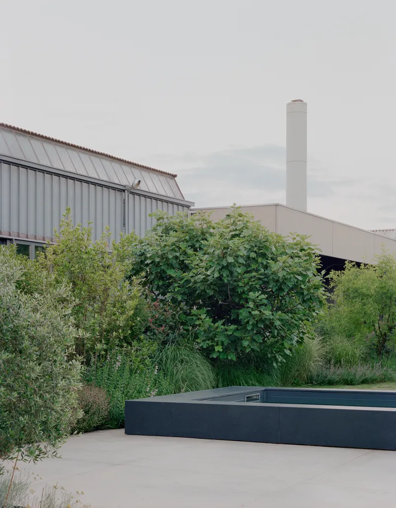 A completare l'intervento, e a definirne il confine, è la piccola piscina, semi incassata nel terreno per emergere dalla pavimentazione in cemento come un volume monolitico in pietra antracite, offrendo agli ospiti una grande seduta.