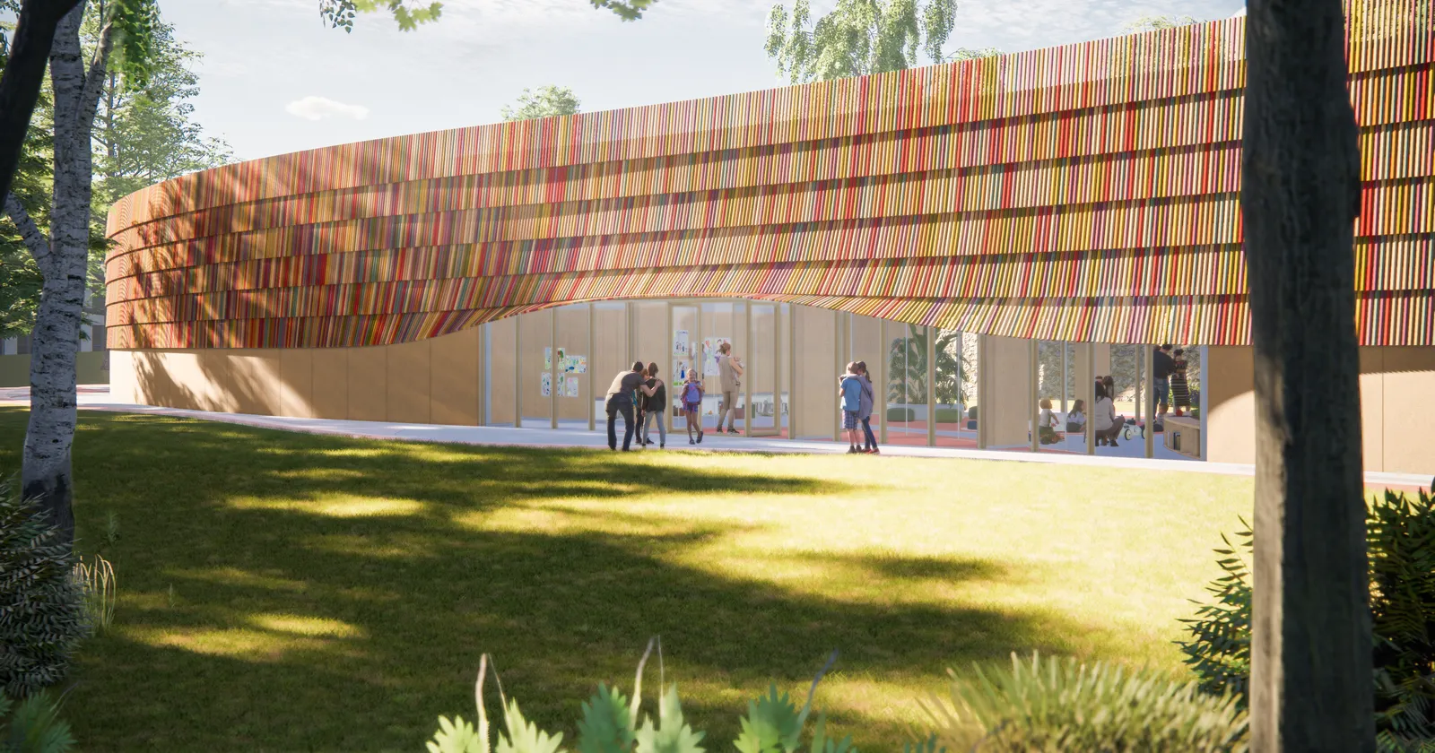 Il progetto rievoca fantasie geometriche morbide e cromie che permettono alla luce di creare atmosfere diversificate per le diverse età. La componente dinamica è evidente anche dall'esterno, con il rivestimento in listelli di alluminio verticali, ispirato alle collane di peperoni dolci, che garantisce l'illuminazione ideale durante le ore della giornata.