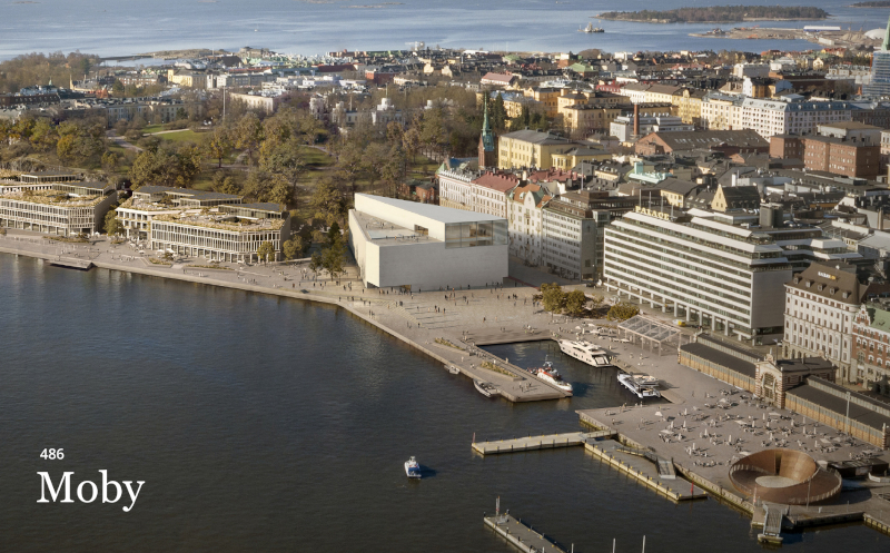 La proposta 486 Moby immagina un nuovo edificio cuneiforme. È modellato in modo da lasciare spazio sul lato per le viste dal lungomare verso il parco Tähtitorninvuori. La facciata principale, di 49 metri, guarda verso la città, la cattedrale e il municipio, accoglie il visitatore con i suoi ampi spazi esterni al coperto. Sul lato opposto la facciata che guarda il promontorio, ampia solo cinque metri, si sviluppa in altezza. Grazie alla sua forma compatta, al sistema strutturale razionale e all'uso di materiali riciclati, l'edificio promette un uso efficiente delle risorse.