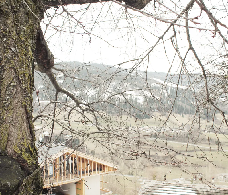 Ne deriva un progetto perfettamente riuscito tra antico e contemporaneo, caratterizzato da forme archetipiche in accordo con ritmi di facciata dinamici. La struttura in legno, palesata dall'esterno, richiama la tradizione e mantiene inalterato l'equilibrio esistente, favorendo una continuità fra l'intimità degli spazi interni e l'apertura verso il suggestivo paesaggio di montagna.