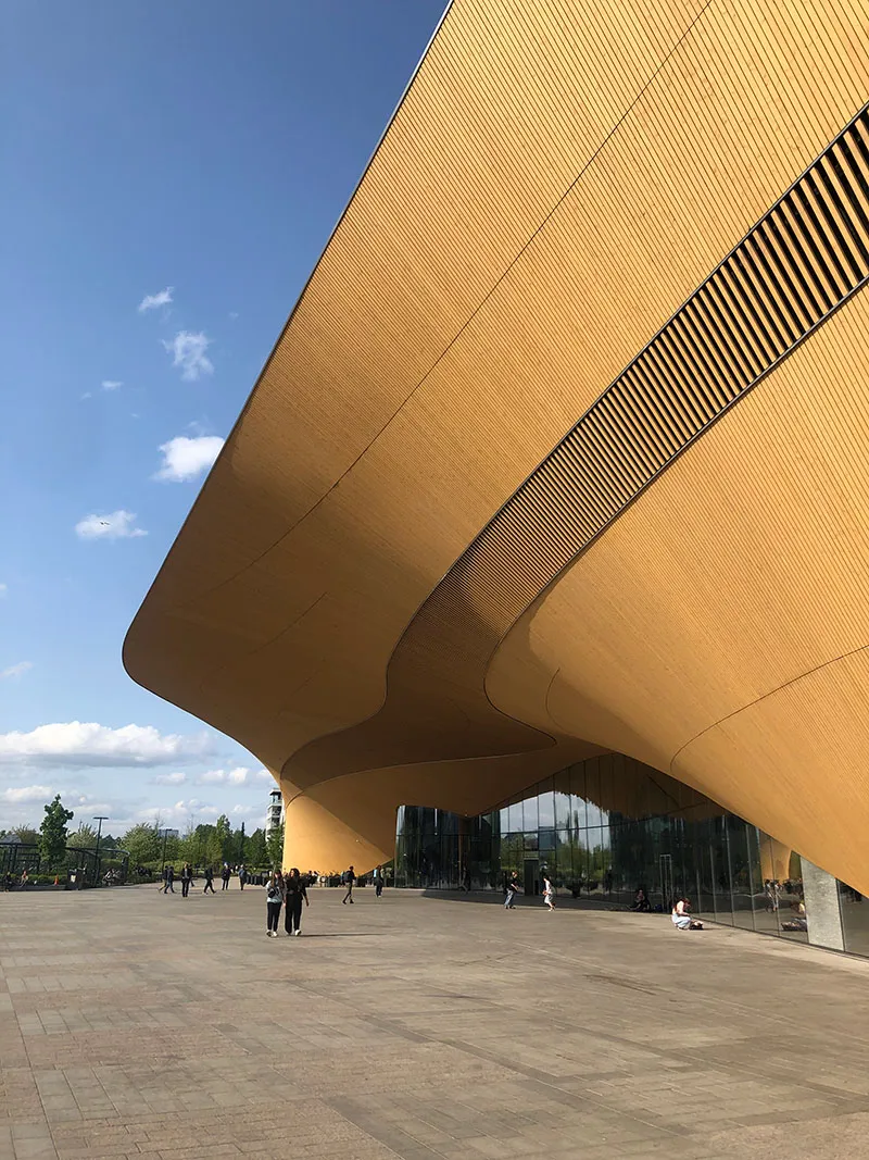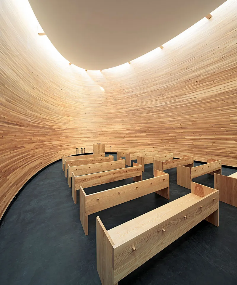 Il progetto, firmato dallo studio finlandese K2S Architects, si erge sulla piazza con un volume scultoreo caratterizzato da una facciata curva realizzata in legno di abete rosso, adeguatamente insonorizzata e completamente priva di aperture per proteggere lo spazio sacro dal caos della città.