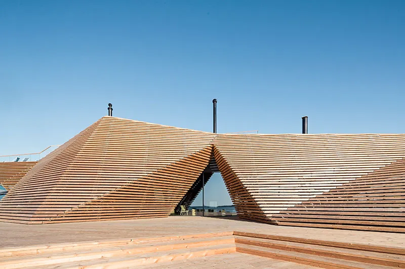 Un dinamico gioco di superfici e volumi in legno che si articolano lungo la costa rocciosa del mar Baltico caratterizzato Löyly. La prima sauna pubblica finlandese costruita totalmente in legno a Hernesaari un nuovo distretto marittimo della città di Helsinki. Il progetto, firmato da Avanto Architects e da Joanna Laajisto Creative Studio, coniuga le tradizioni costruttive locali con il design contemporaneo generando un forte dialogo tra architettura, uomo e natura.