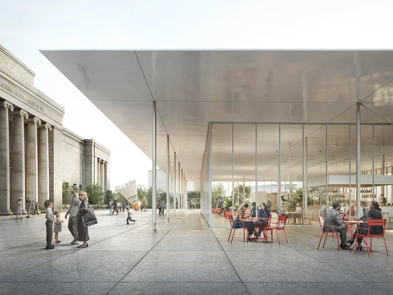 Concepita come "un abbraccio", la proposta avvolge i tre lati del museo esistente, creando nuove connessioni tra galleria, paesaggi e città. Il volume del nuovo padiglione d'ingresso accoglie i visitatori, mentre un nuovo sistema di percorsi collega spazi per l'arte, eventi, ristorazione e giardini. Fiore all'occhiello, la nuova Sky Wing, pensata per offrire una vista prospettica privilegiata su Kansas City.