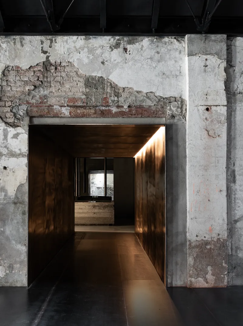 Il passato industriale e l'autenticità del luogo emergono candidamente nelle pareti lasciate volutamente allo stato grezzo, enfatizzati dalla sovrapposizione di elementi contemporanei in ferro ossidato, come la grande pergola che domina la piazza.