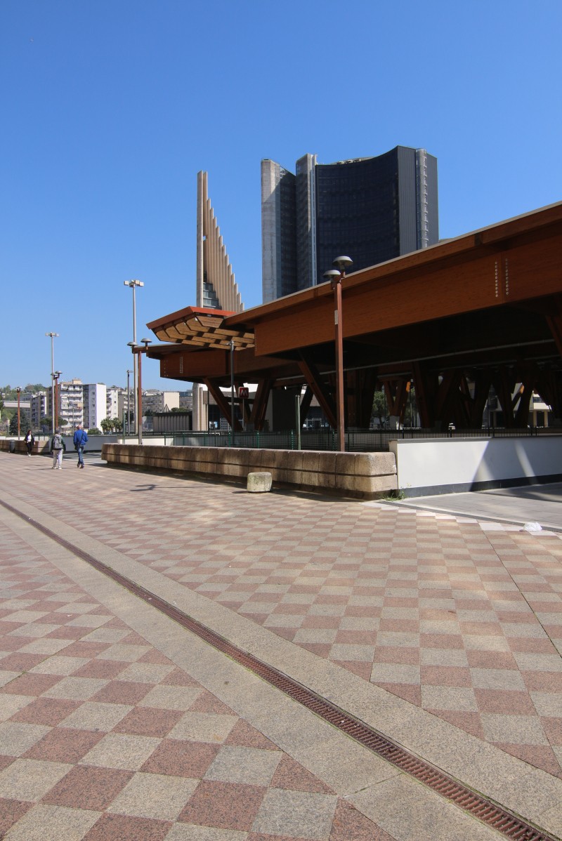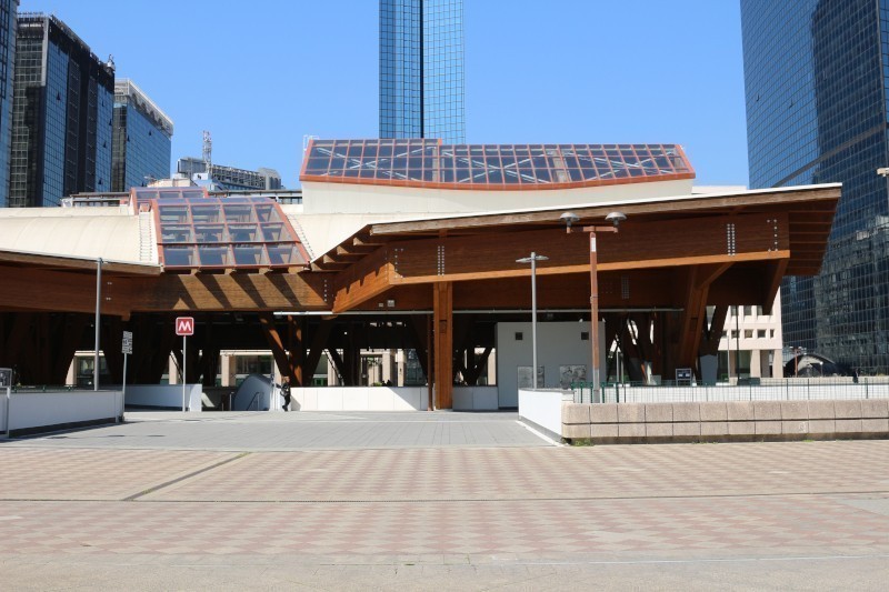 Niente arte e nemmeno archeologia per la stazione del Centro direzionale, ma l'eccezionalità della bellezza da godere in viaggio resta. Il calore del legno, le linee sinuose che, come in un collage, sono interrotte da piani spigolosi, rese dinamiche dal gioco di luci e ombre che il complesso disegno proietta ovunque, si oppongono alla rigidità e all'anonimità del centro direzionale suddiviso in rigidi livelli funzionali (quello pedonale al piede dei grattacieli e quello per le auto al di sotto), dimostratisi un grosso fallimento. Impossibile con una "semplice" stazione sconvolgere e rompere lo schema di Kenzo Tange ideatore del centro per uffici. E, allora, ribellarsi è la soluzione.