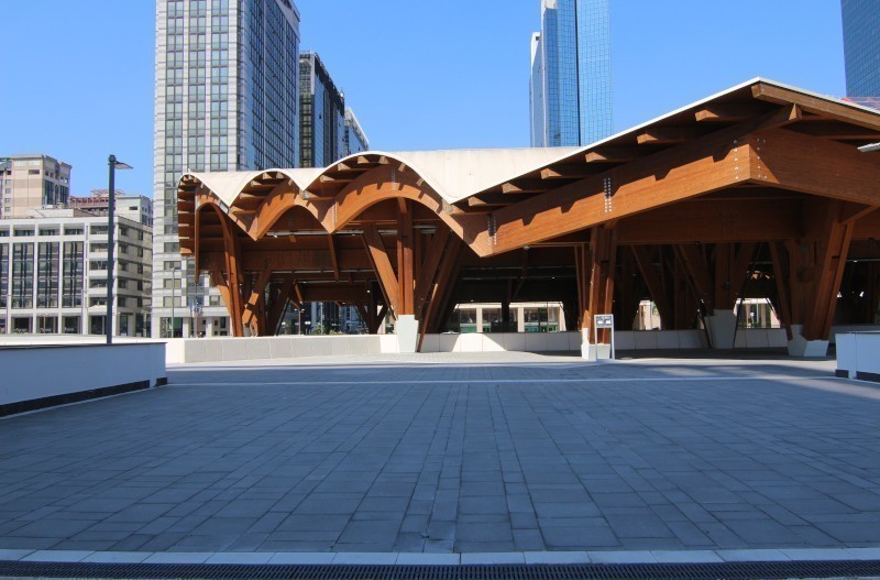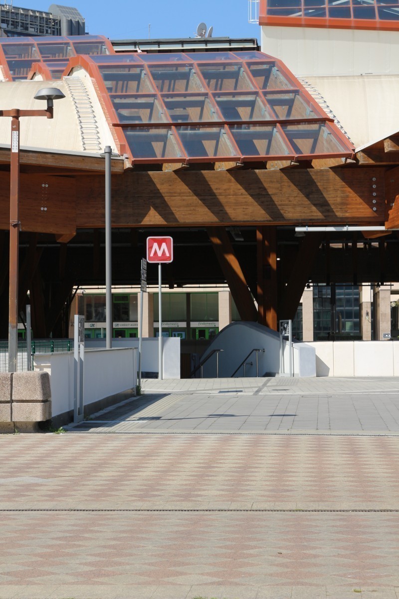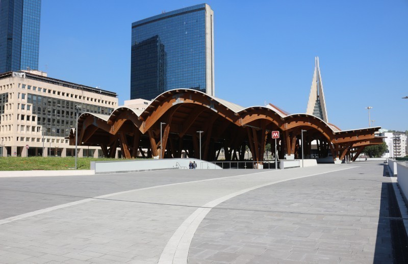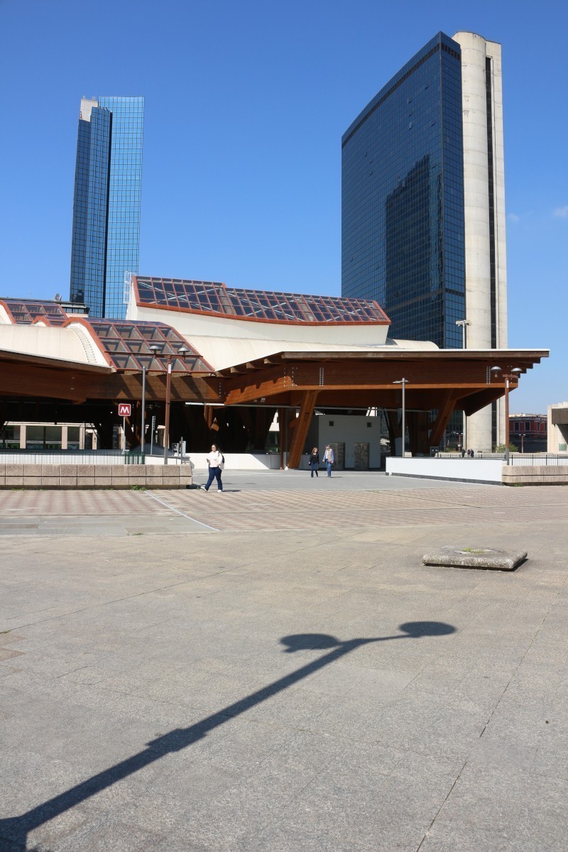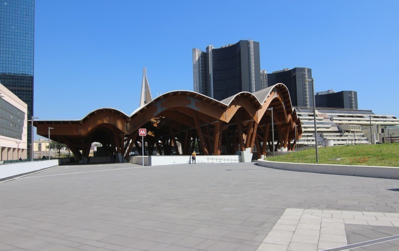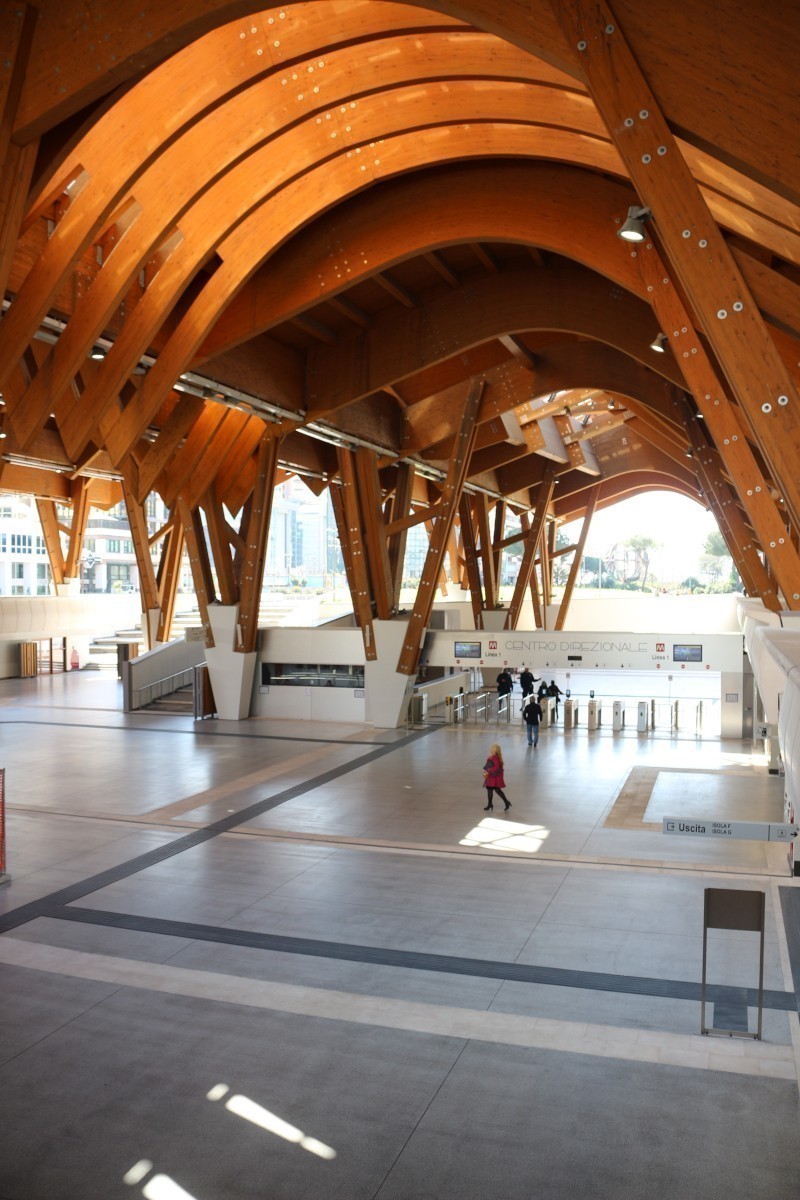«In un certo senso, ciò che abbiamo cercato di realizzare - scrive ancora lo studio Embt - è una sorta di nuova piazza organica e fluida, come se stessimo camminando in una foresta, quando in realtà ci troviamo in un centro commerciale artificiale». Negli spazi della stazione, come nell'intero centro direzionale, le persone si disperdono: i flussi non sono così copiosi e tutto appare sovradimensionato, forse lo è o forse è tutto il centro direzionale da ripensare e ripopolare di giorno fino a sera. Sui binari esplode il colore dei pannelli lineari scanditi da sagome e nicchie dove sedersi.