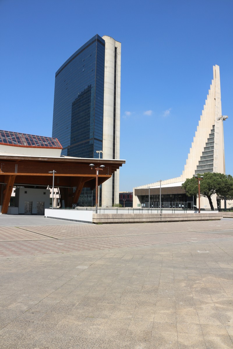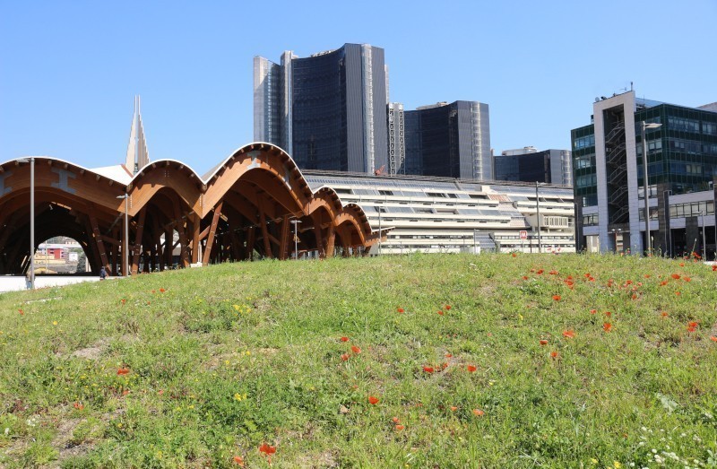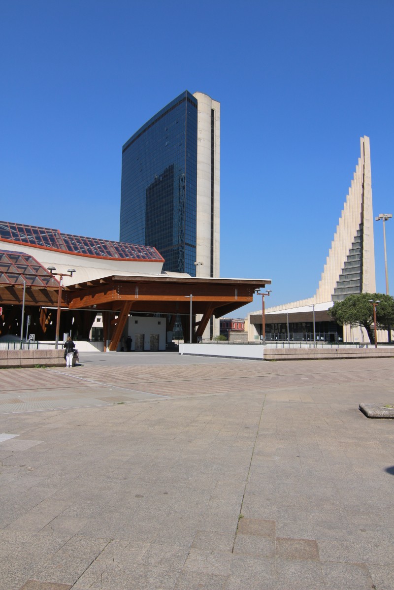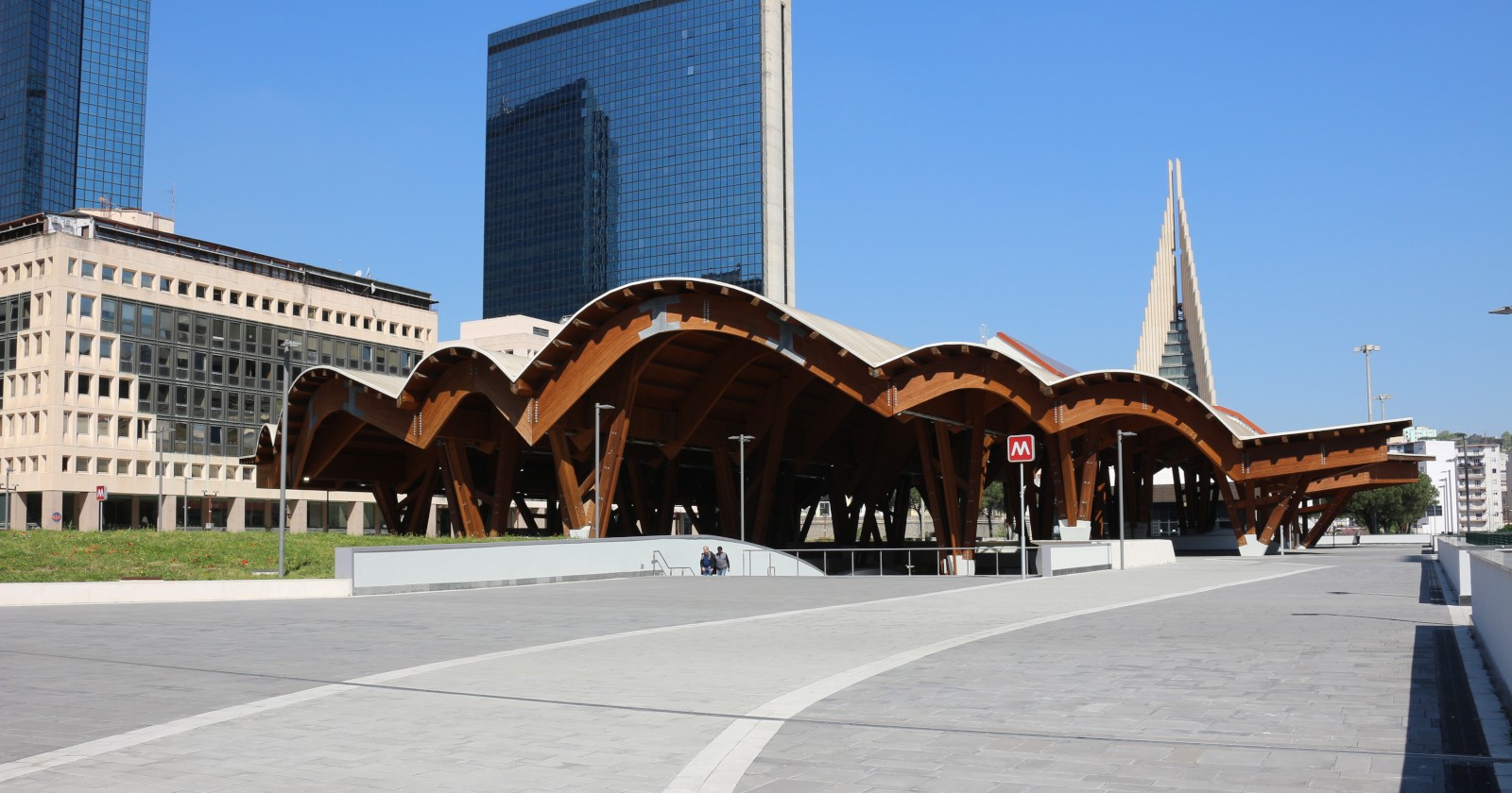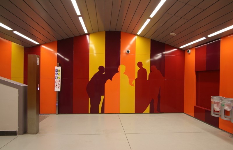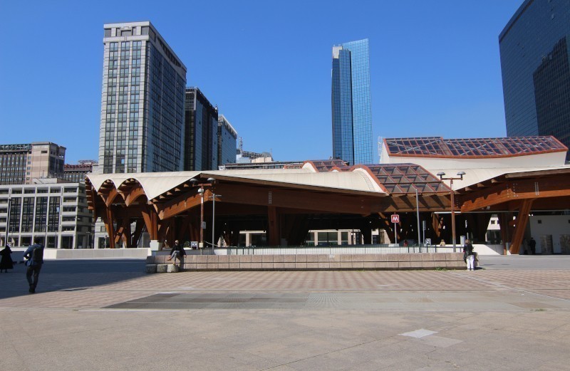 «In un certo senso, ciò che abbiamo cercato di realizzare - scrive ancora lo studio Embt - è una sorta di nuova piazza organica e fluida, come se stessimo camminando in una foresta, quando in realtà ci troviamo in un centro commerciale artificiale». Negli spazi della stazione, come nell'intero centro direzionale, le persone si disperdono: i flussi non sono così copiosi e tutto appare sovradimensionato, forse lo è o forse è tutto il centro direzionale da ripensare e ripopolare di giorno fino a sera. Sui binari esplode il colore dei pannelli lineari scanditi da sagome e nicchie dove sedersi.