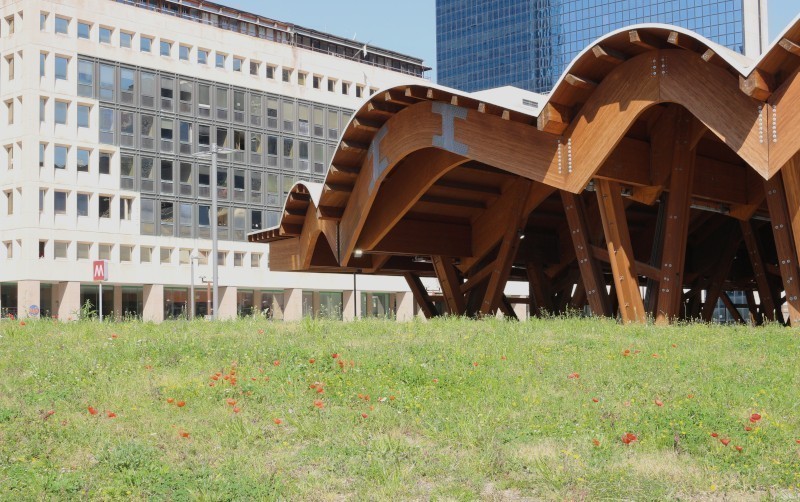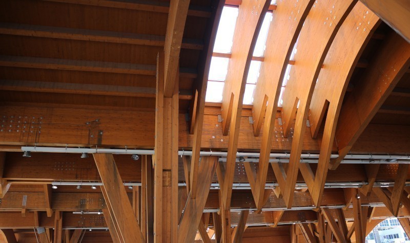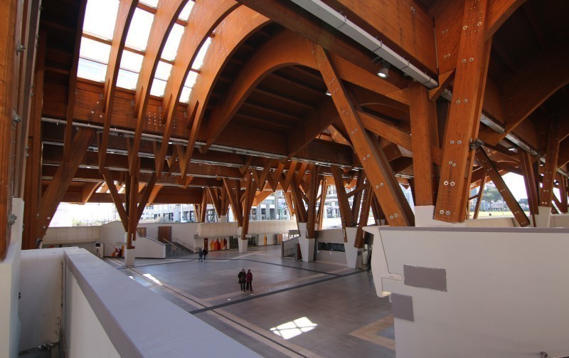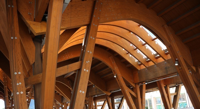 Il legno è il materiale principale e «crea un contrasto organico» con il centro ideato negli anni Settanta del secolo scorso e, spontaneamente, rimanda subito per forma al mercato di Santa Caterina a Barcellona, progettato sempre dallo studio Embt.