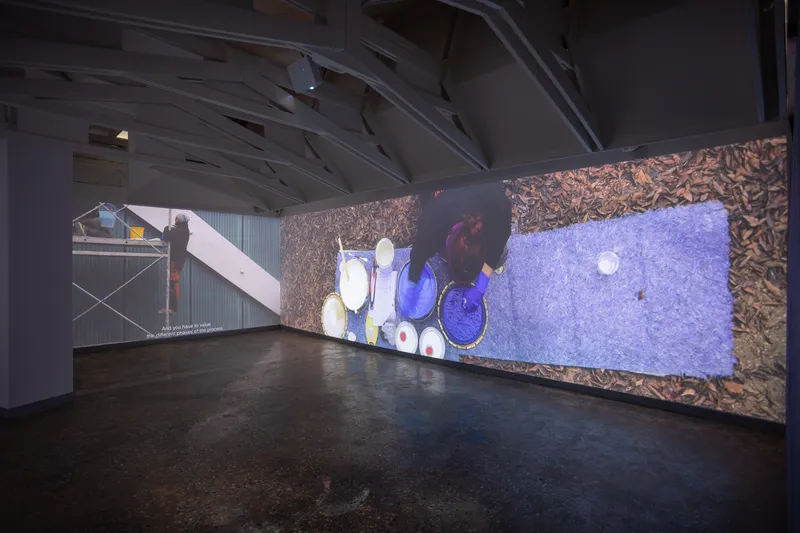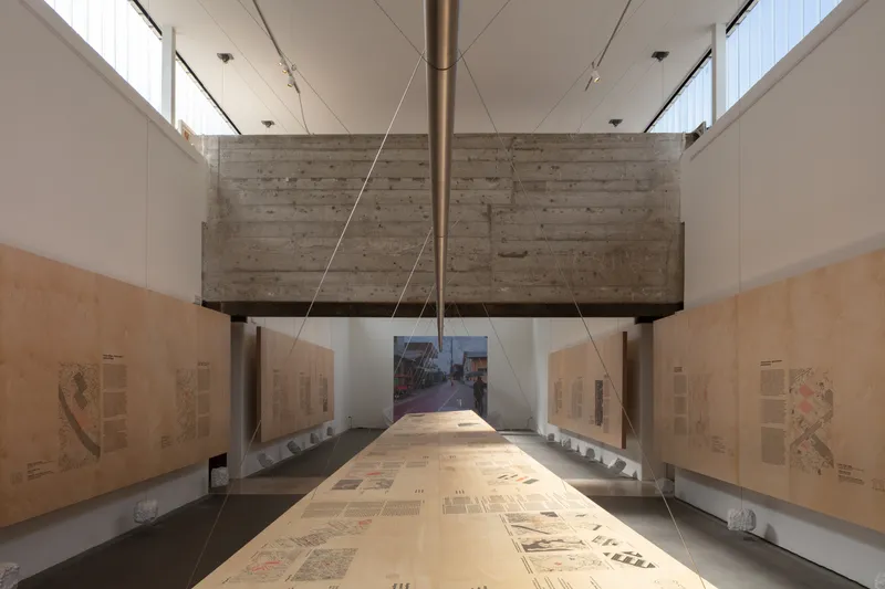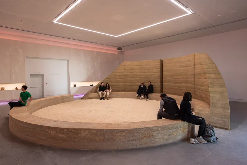 L'allestimento, che richiama i toni della terra, è un'esperienza immersiva e sensoriale e, attraverso suoni e superfici tattili, induce alla riflessione sulle metodologie indigene come strumenti per ripensare l'architettura contemporanea.