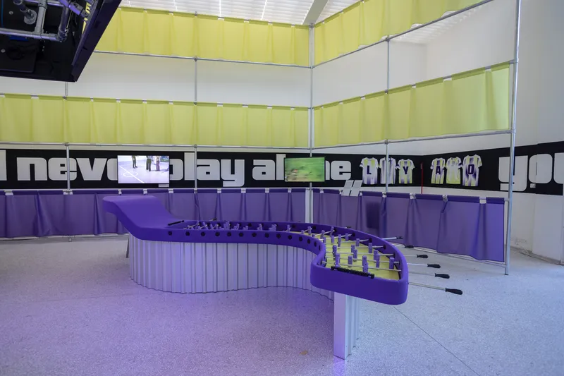 L'ingresso al padiglione è certamente d'impatto: un bar dello sport con tanto di sciarpe in stile calcistico e un grande tavolo di calcio balilla sinuoso al centro.