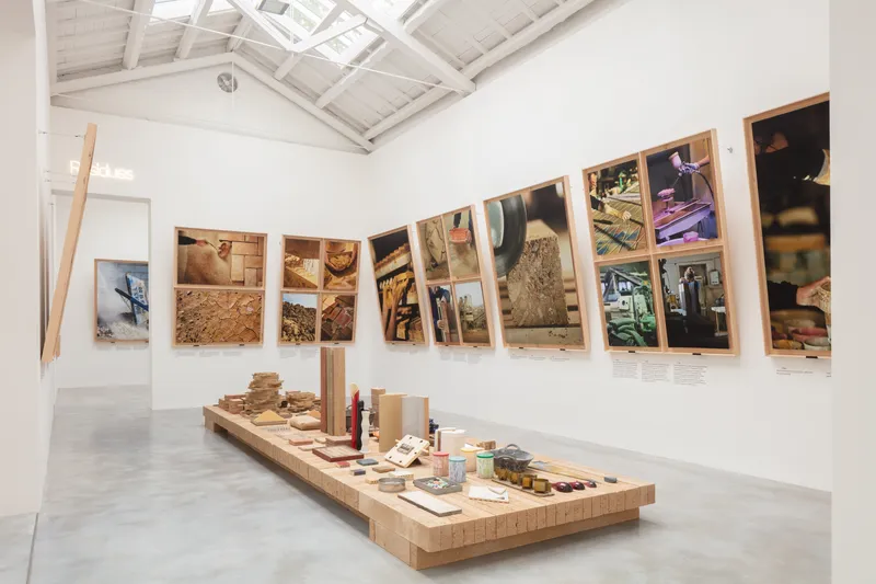 Suddiviso in due sale principali, il progetto curatoriale espone modelli, installazioni, campioni di materiali e fotografie di grande formato che mettono in dialogo i luoghi di estrazione delle risorse e quelli della costruzione.