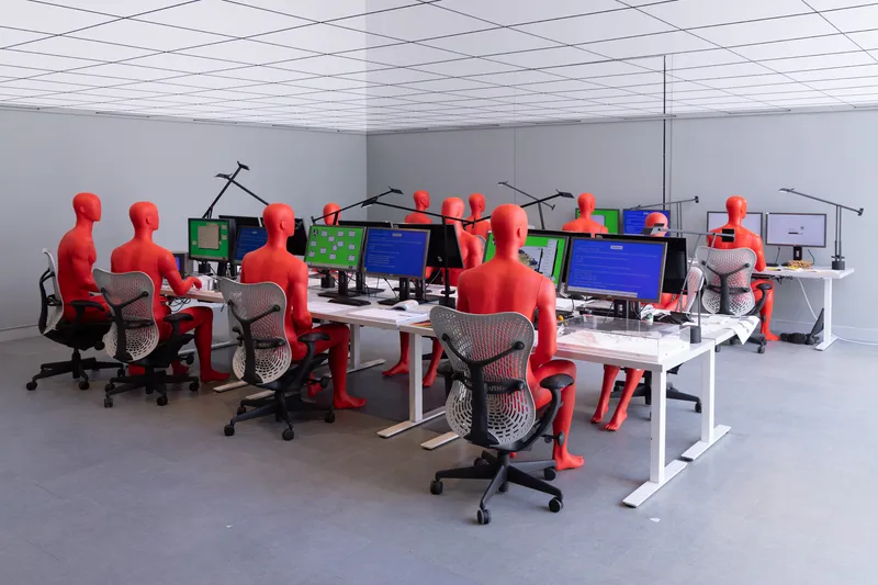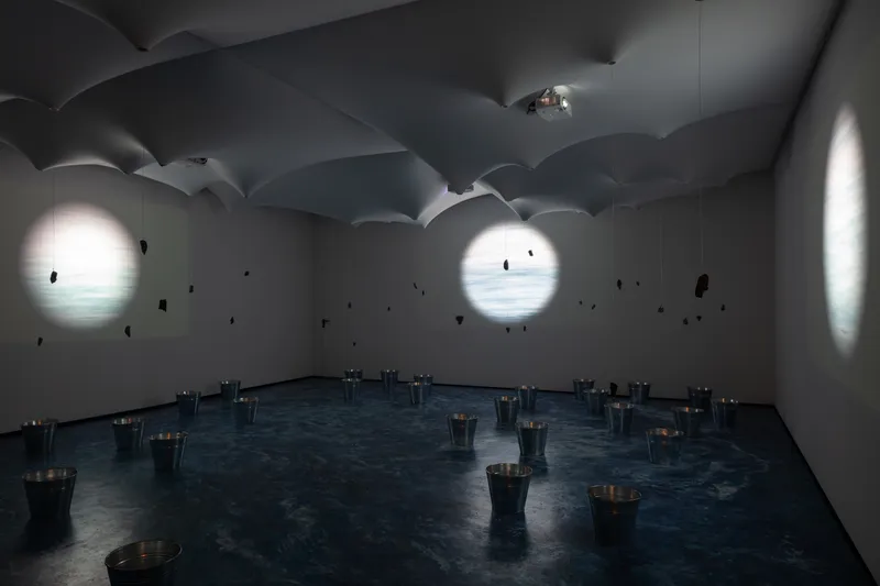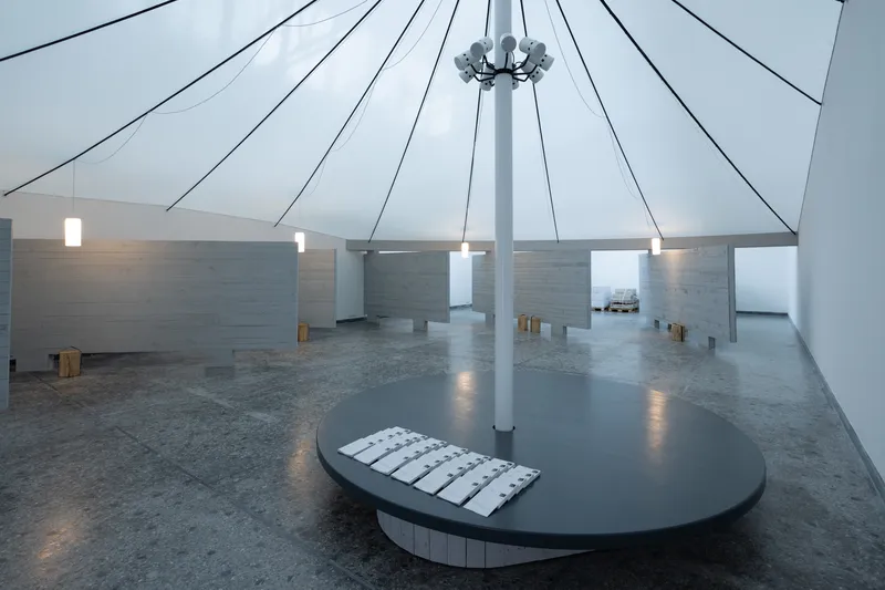 Al centro della sala trova spazio un'installazione cinetica di fili di lana intrecciati da architetti, designer e ingegneri che continuerà a lavorare per tutta la durata della Biennale grazie a 150 motori solari, rivelando un'architettura in trasformazione che sfida le convenzioni e abbraccia pratiche sostenibili e in continua evoluzione.