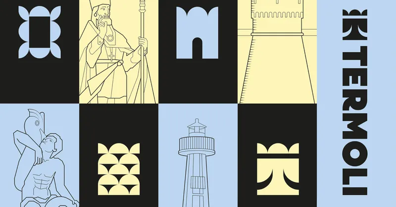 Un linguaggio visivo modulare descrive Termoli attraverso cinque simboli chiave, tra mare, architettura e tradizioni locali. Colori naturali e forme morbide esprimono il carattere accogliente e dinamico della città, tra radici profonde e slancio verso il futuro.