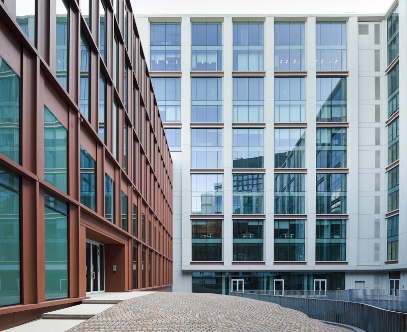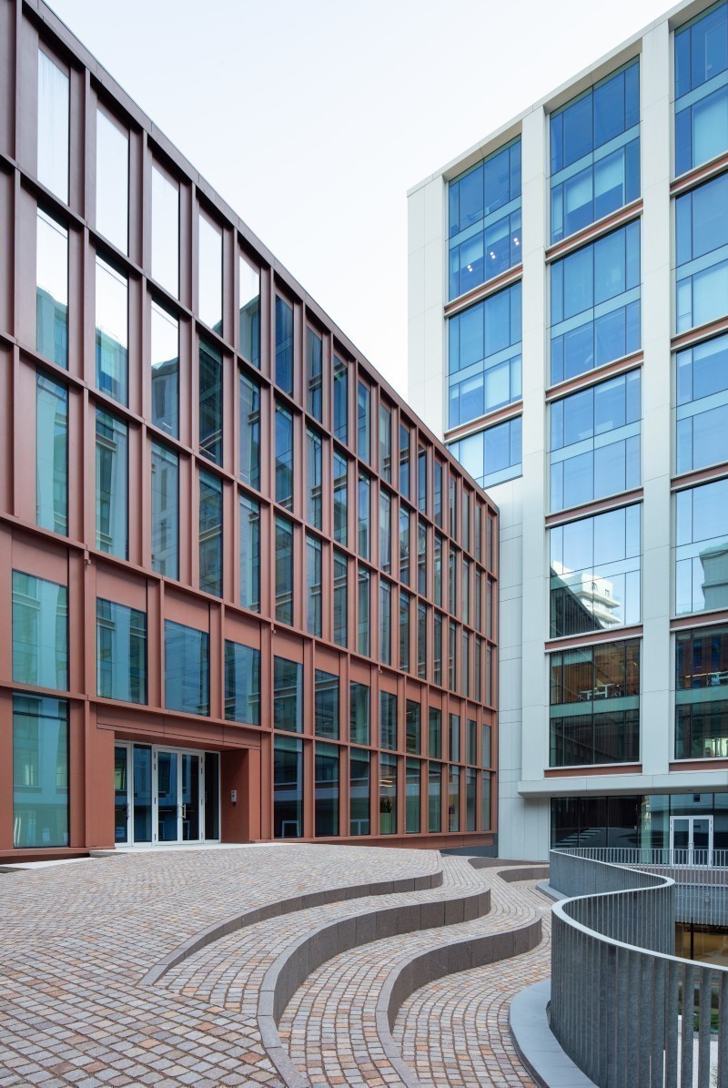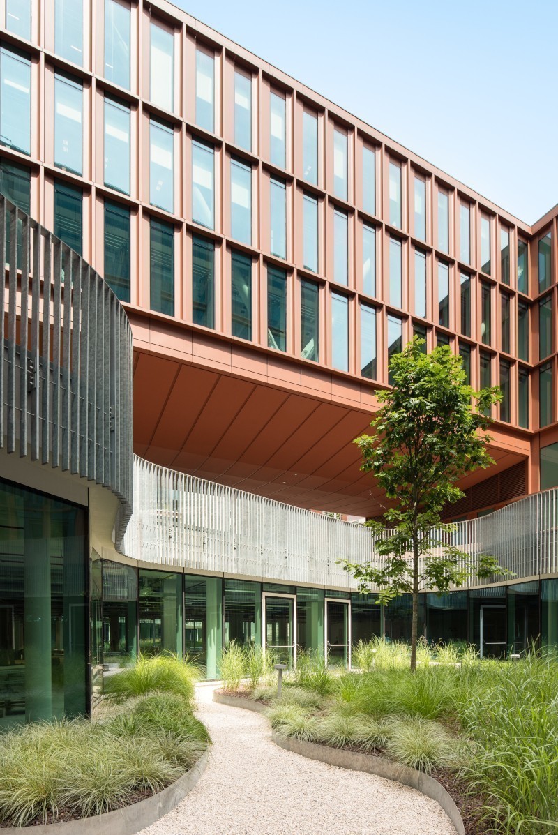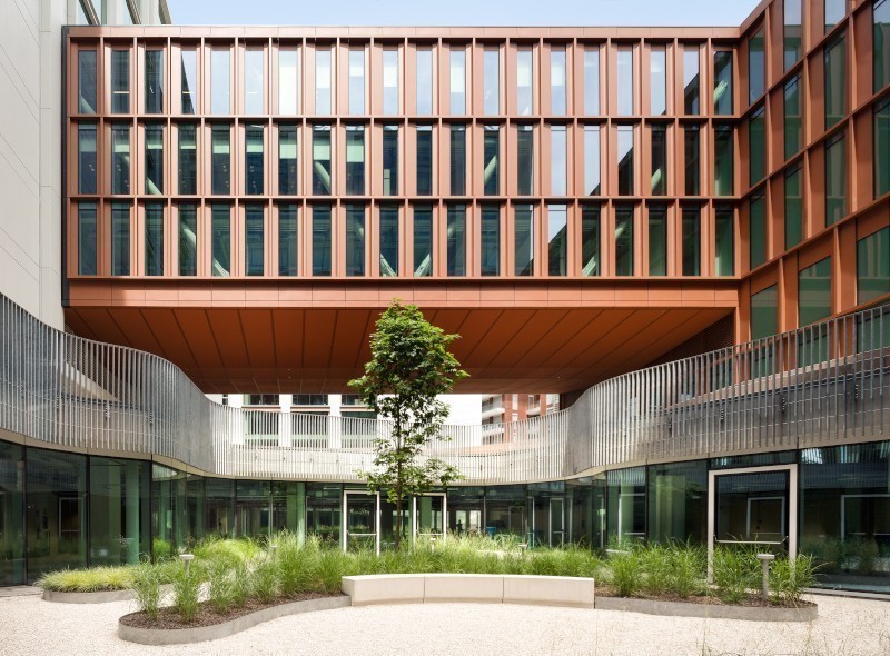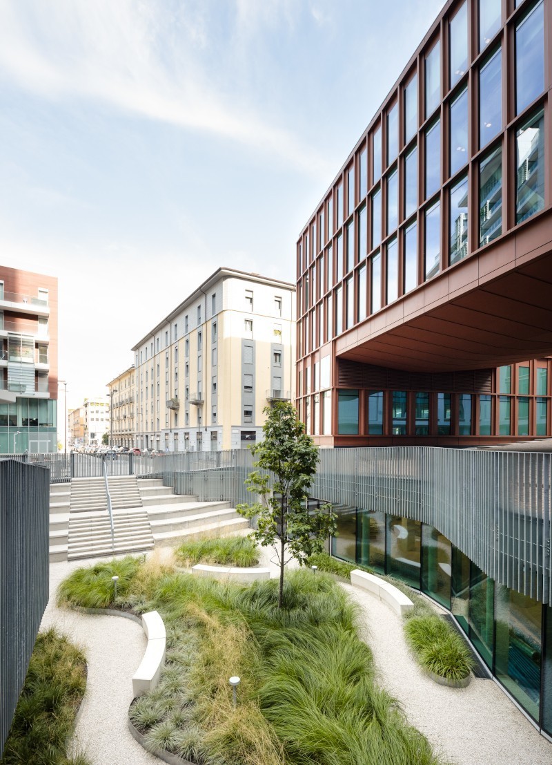 Questo intervento rompe la rigidità della struttura originaria, potenziandone drasticamente la permeabilità e integrando armoniosamente il sito con il contesto circostante. Il risultato è uno spazio verde vivace, intrecciato al tessuto urbano - un punto d'incontro accogliente che favorisce l'interazione tra fruitori e cittadini, ridefinendo il rapporto dell'edificio con la città. La nuova corte, pavimentata con un tappeto di pietra ondulata, incoraggia il passaggio pedonale, creando una connessione diretta e fluida tra la stazione centrale di Milano e Bam, il giardino contemporaneo di Porta nuova. Le ampie aperture a tutta altezza incorniciano questo spazio, favorendo la trasparenza e rafforzando il dialogo tra gli interni dell'edificio e l'ambiente urbano.