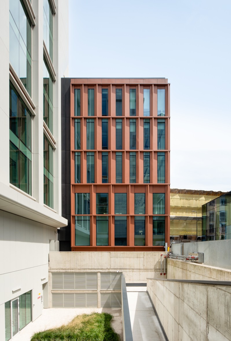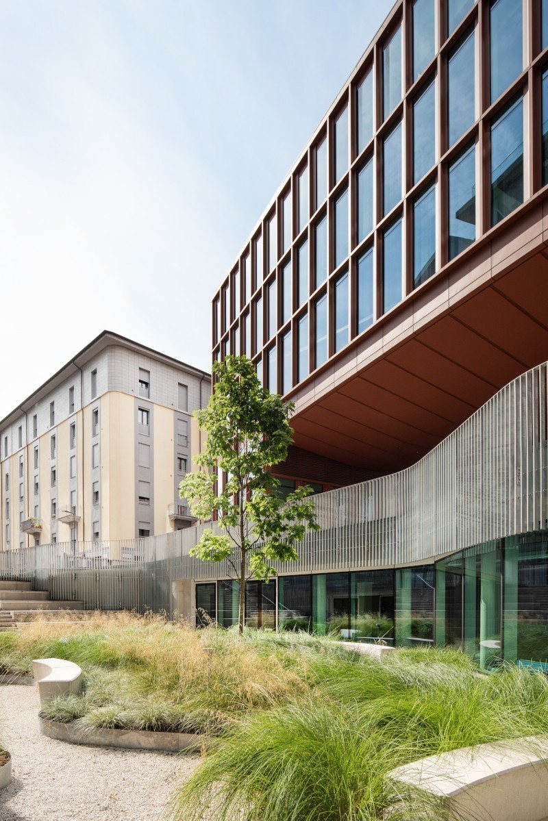 «La facciata su via Bordoni, compreso l'elemento a ponte, è rivestita in metallo con una finitura testurizzata in vernice color terracotta, in dialogo con la scala residenziale del quartiere. La struttura originale, invece, è stata riqualificata con una finitura effetto cemento, in armonia con i grattacieli contemporanei di Porta Nuova, trovando un equilibrio tra storia e innovazione», spiega lo studio Park in una nota.