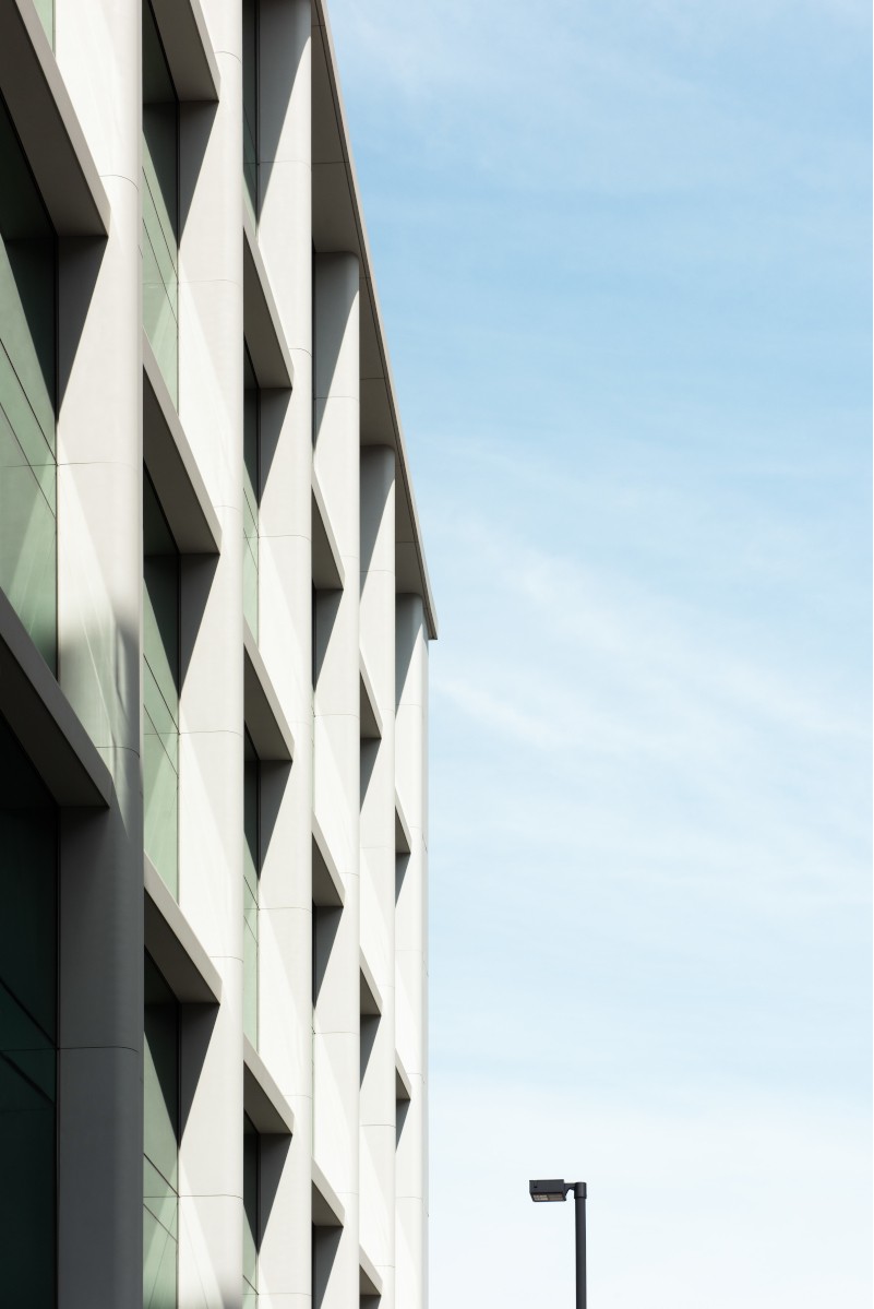 Un'ampia pensilina fotovoltaica alimenta una pompa di calore acqua-acqua, ottimizzando la produzione termica, mentre sistemi smart monitorano e migliorano l'efficienza energetica. Lo spostamento della facciata dietro la griglia strutturale esistente consente inoltre di ridurre il guadagno solare, migliorando le prestazioni ambientali senza compromettere trasparenza e illuminazione naturale.