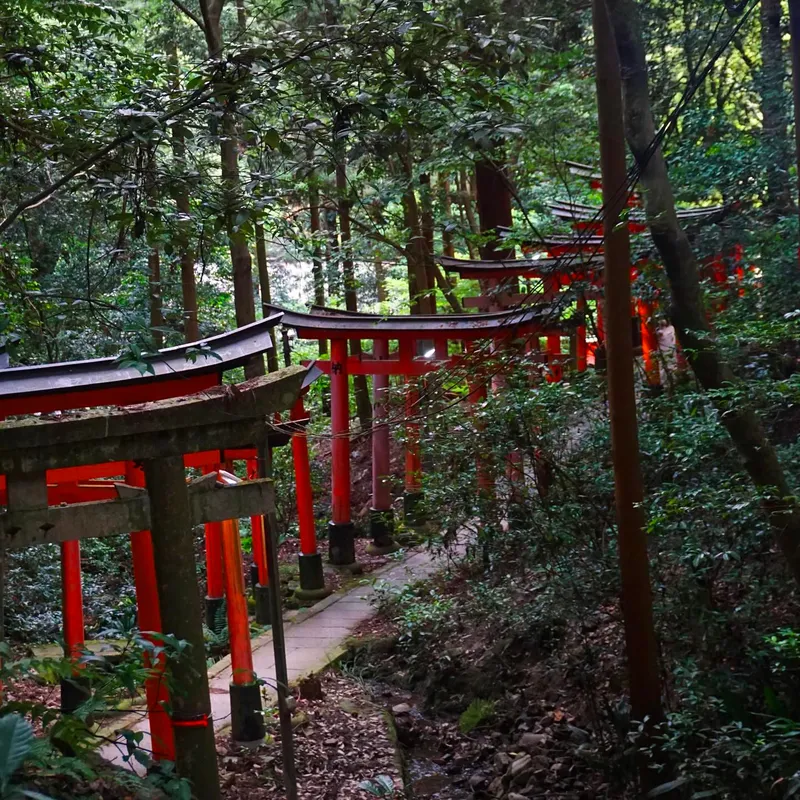 Un percorso apparentemente infinito di porte benaugurali torii arancione brillante e nero che costeggiano la via di accesso al Monte Inari, uno scenario iconico, tra i più famosi del Giappone.